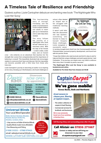 July 2025 | Phonebox Magazine 63%u2022 The widest collection of carpets & hard flooring%u2022 Commercial services for landlords and businessesWe%u2019re now exclusively based out of our workshop at Northey Farm.Call Alistair on 07836 271667We%u2019ve gone mobile!Across Bucks, Beds and Northantsal.captaincarpet@gmail.comContact us today and we will bring our showroom to your doorGreat reasons to choose your flooring at Captain Carpet...Still flooring Olney and surrounding areas after 35 yearsShowroom NOW OPENby appointment%u2022 Wood Venetian%u2022 Shutters%u2022 Perfect Fits%u2022 Rollers%u2022 Day/Night01908 502141info@davesblinds.co.ukwww.davesblinds.co.ukDavesBlindsdavesblinds%u2022 Verticals%u2022 Romans%u2022 Pleated%u2022 Skylights%u2022 VenetianWe offer a FREE, no obligation, quotation and measuring service.%u2019Universal BlindsYour Local Blind SpecialistRoller, Vertical, Venetian, Wooden, Pleated, Roman, Perfect Fit, Shutters, Curtains, Velux%u2022 3 day service on Roller & Vertical Blinds%u2022 Quality Blinds made more affordable%u2022 Free Measuring and Fitting01908 510333 %u2022 07980 979420email: sales@universal-blinds.co.ukwww.universal-blinds.co.ukBuy one Roller or Vertical Blind get one half priceA Timeless Tale of Resilience and Friendship This hear t warming stor y of courage, friendship, and the power of perseverance is set to inspire children and adults to never give up on themselves and to seek help when needed.The stor y follows the journey of a nightingale who finds herself silenced by a merciless wind. With the help of her friends %u2013 a clever snake, a wise bear, and an honest crow %u2013 she embarks on an adventure that teaches her the strength that comes from companionship and the importance of believing in oneself. This beautifully illustrated tale encourages readers to overcome their fears and discover that the impossible can become possible with a little help from those who truly care.Lizzie Cantopher%u2019s journey to becoming an author is as inspiring as her story. Growing up in Northampton, she faced challenges in Dyslexic author, Lizzie Cantopher debuts an enchanting new book: %u2018The Nightingale Who Lost Her Song%u2019school, often labeled as %u2018stupid%u2019 due to her struggles with traditional learning methods. It wasn%u2019t until later that she discovered she was dyslexic, s o m e t h i n g s h e learned to keep to h e rse l f. D e s p i te these challenges, Lizzie navigated a successful career in nursing, brought back Gold from the Commonwealth Archery Championships, pursued property development, and found love with her partner, Annie.%u201cI hope that children who read my book see that it%u2019s okay to ask for help and that their unique challenges can lead to great stories,%u201d said Cantopher. %u201cIf my journey can inspire even one child to embrace their voice, then I consider my work a success.%u201d%u2018The Nightingale Who Lost Her Song%u2019 is now available in bookstores and online. Available for Pre Order Now from Amazon at %u00a319.99
