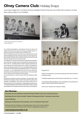 8 Phonebox Magazine | July 2025Olney Camera Club: Holiday SnapsJust a few images from my family archives highlight the fact that ever since folks had a camera, we have been taking snaps on our holidays.Next Meetings:www.olneycameraclub.co.ukWednesday 16th July: Kathy Brown%u2019s Garden & Stevington Windmill. Starts 7pm, meeting at Stevington.Wednesday 30th July: Talk by Anne Miles: %u201cWeather to Photograph and What%u201d. Starts 8pm at Olney Centre.August: No Meeting.Wednesday 24th September: Club Competition, round 3. Starts 8pm at Olney Centre.For further information, call Andy on 01234 714570, or info@olneycameraclub.co.ukTo a creative photographer a smartphone camera can seem a bit limited, but they are very useful as a small, go-anywhere device. A mediocre camera doesn%u2019t always mean a mediocre shot. With a Kodak folding %u2018pocket%u2019 camera having a small viewfi nder, my dad seemed challenged to keep the horizon level, and in the image of my family outside a hostelry, that could be his artistic intent, but he should have also pointed the camera a tad to the left.The takeaway from these snaps is that there is little image composition here, other than a holiday record of the family; that was their primary intent, after all. Including family members will give signifi cance to your images, but the viewer deserves more. Selfi es can facilitate this idea by combining yourself in front of an interesting background; but conversely, with the landscape photography theme, it is customary to exclude %u2013 or even delete people from the shot as they often are a distraction from the narrative: the curve of the river, or the sunset light; as your viewer%u2019s eyes are drawn around the image.So, next trip away, try to %u2018make%u2019 a picture rather than taking an instant snap. Remember: smartphone cameras are limited. They work OK in most situations but struggle in others, and when they work, the quality is only passable, not exceptional. Why is this a good thing in this case? It%u2019s because by far the most critical factor in image quality isn%u2019t the camera %u2013 it%u2019s the photographer and the decisions they make. Problem-solving with limitations is an excellent exercise in improving your photography. Three images, all taken by my parents (sadly deceased).We also hold %u2018Social%u2019 meetings on the third Wednesday of the month at various locations.Suggestions:%u2022 Switch on the grid lines on your phone to help get horizon level as well as a composition check.%u2022 Try diff erent aspect ratios to see if it improves composition: e.g, 1:1, 9:16, etc. %u2022 Try switching to Black & White as it can be forgiving of low-quality phone images as well as emphasizing the image tones.%u2022 Don%u2019t rush it. Take your time. Enjoy your holiday.