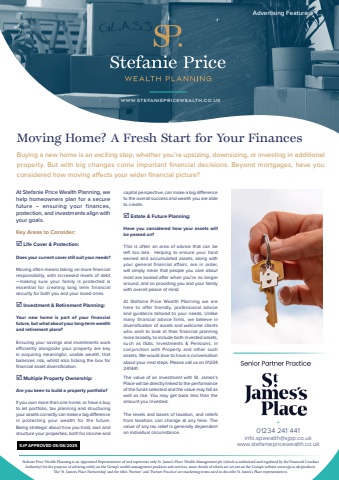 July 2025 | Phonebox Magazine 9At Stefanie Price Wealth Planning, we help homeowners plan for a secure future %u2013 ensuring your finances, protection, and investments align with your goals.Key Areas to Consider:%uf0fe Life Cover & Protection: Does your current cover still suit your needs?Moving often means taking on more fi nancial responsibility, with increased levels of debt %u2014making sure your family is protected is essential for creating long term financial security for both you and your loved ones.%uf0fe Investment & Retirement Planning:Your new home is part of your financial future, but what about your long-term wealth and retirement plans? Ensuring your savings and investments work e ciently alongside your property are key in acquiring meaningful, usable wealth, that balances risk, whilst also ticking the box for fi nancial asset diversifi cation.%uf0fe Multiple Property Ownership:Are you keen to build a property portfolio?If you own more than one home, or have a buy to let portfolio, tax planning and structuring your assets correctly can make a big di%u008d erencein protecting your wealth for the future. Being strategic about how you hold, own and structure your properties, both for income and capital perspective, can make a big di%u008d erence to the overall success and wealth you are able to create.%uf0fe Estate & Future Planning: Have you considered how your assets will be passed on? This is often an area of advice that can be left too late. Helping to ensure your hard earned and accumulated assets, along with your general fi nancial a%u008d airs, are in order, will simply mean that people you care about most are looked after when you%u2019re no longer around, and so providing you and your family with overall peace of mind.At Stefanie Price Wealth Planning we are here to offer friendly, professional advice and guidance tailored to your needs. Unlike many financial advice firms, we believe in diversifi cation of assets and welcome clients who wish to look at their fi nancial planning more broadly, to include both invested assets, such as ISAs, Investments & Pensions, in conjunction with Property and other such assets. We would love to have a conversation about your next steps. Please call us on 01234 241441.The value of an investment with St. James%u2019s Place will be directly linked to the performance of the funds selected and the value may fall as well as rise. You may get back less than the amount you invested. The levels and bases of taxation, and reliefs from taxation, can change at any time. The value of any tax relief is generally dependent on individual circumstance.Advertising FeatureMoving Home? A Fresh Start for Your FinancesBuying a new home is an exciting step, whether you%u2019re upsizing, downsizing, or investing in additional property. But with big changes come important fi nancial decisions. Beyond mortgages, have you considered how moving a%u0090 ects your wider fi nancial picture?www.stefaniepricewealth.co.uk%u2022 01234 241 441info.spwealth@sjpp.co.ukSJP APPROVED 05/06/2025 www.stefaniepricewealth.co.ukStefanie Price Wealth Planning is an Appointed Representative of and represents only St. James%u2019s Place Wealth Management plc (which is authorised and regulated by the Financial Conduct Authority) for the purpose of advising solely on the Group%u2019s wealth management products and services, more details of which are set out on the Group%u2019s website www.sjp.co.uk/products. fi e %u2018St. James%u2019s Place Partnership%u2019 and the titles %u2018Partner%u2019 and %u2018Partner Practice%u2019 are marketing terms used to describe St. James%u2019s Place representatives.