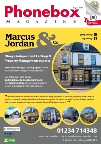 August 2025 | Phonebox Magazine 130YEARSLatest Local News Events & BusinessAugust 2025MJLettings@MJLettings01234 714348www.marcusjordan.co.uk %u2022 enquiries@marcusjordan.co.uk1 Market Place, Olney, MK46 4EAOlney%u2019s independent Lettings & Property Management expertsWe%u2019re more than just letting agents; we%u2019re your partners in property management. Our extensive reach across Bedfordshire, Buckinghamshire and Northamptonshire ensures your property is seen and leased by the right tenants. We have valued the service with MarcusJordan for many years now. As landlords, they have always been on hand for any queries we%u2019ve had, and act quickly when required. It is always a smooth and hassle%u2011free experience when a tenant leaves and a new one moves in. We would highly recommend.