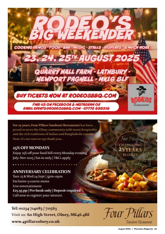 August 2025 | Phonebox Magazine 19RODEO%u2019S BIG WEEKENDERCOOKING DEMOS - FOOD - BAR - MUSIC - STALLS - DISPLAYS - & MUCH MORE23, 24, 25TH AUGUST 2025QUARRY HALL FARM - LATHBURY - NEWPORT PAGNELL - MK16 8LFBUY TICKETS NOW AT RODEOSBBQ.COMFIND US ON FACEBOOK & INSTAGRAM OR EMAIL EVENTS@RODEOSBBQ.COM - 07775 695316Tel: 01234 714083 / 711563Visit us: 60 High Street, Olney, MK46 4BEwww.4pillarsolney.co.ukFour PillarsTandoofi RestaurantCELEBRATING YEARS IN OLNEYFour PillarsFor 25 years, Four Pillars Tandoori Restaurant has been proud to serve the Olney community with warm hospitality and the rich traditions of Indian and Bangladeshi cuisine. Now, it%u2019s our turn to say thank you...25% OFF MONDAYSEnjoy 25% off your food bill every Monday eveningJuly%u2013Nov 2025 | Eat-in only | T&Cs applyANNIVERSARY CELEBRATIONTues 23 & Wed 24 Sept | 5pm%u201311pmExclusive 5-course menuLive entertainment%u00a325.95 pp | Pre-book only | Deposit requiredCall now to register your interest.