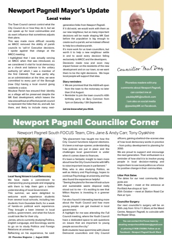 22 Phonebox Magazine | August 2025Newport Pagnell Mayor%u2019s UpdateNewport Pagnell Councillor CornerYou can contact the Focus team by emailing newportsouthlibdems@gmail.com or phoning 01908 216366. Follow us on Facebook %u2013 Newport Pagnell South Ward Newport Pagnell South FOCUS Team, Cllrs Jane & Andy Carr, Tony OyakhireLocal Young Voices in Local DemocracyWe have made a commitment to championing young people and engaging with them to help them gain a better understanding of local Government. This summer, we were delighted to welcome work experience students from several local schools, including two students from Ousedale Sixth, for a week of hands-on political work experience. They brought a keen interest in local politics, government, and what the future could look like for their city.James, who is currently studying Politics, English Language, and Sociology, wants to go on to study Politics and Foreign Relations at university.Refl ecting on his experience, he said: %u201cMy placement has taught me how the City Council functions beyond elections. It%u2019s been a real eye-opener, understanding how policies are put in place and the challenges local government is under when it comes down to fi nances. It%u2019s been a fantastic insight to learn more about how the City Council works with MPs to raise important issues in parliament.%u201d Rhia, who is also studying Politics, as well as History and Psychology, hopes to continue Psychology at university, and has also found the experience helpful:%u201cSeeing the plans for the new infrastructure and sustainable waste disposal really stood out to me %u2013 it%u2019s exciting to see that Milton Keynes is investing in a greener future. I%u2019ve also found it interesting learning more about the Youth Council and how more young people can get involved in local government.A highlight for me was attending the Full Council meeting, where the Youth Council have a dedicated space to ask questions on issues that are important to young people across the city.%u201dBoth students have spent time with Liberal Democrat councillors and City Council The Town Council cannot control what the City Council do or how they do it, but we can speak up for local communities and do exert infl uence that sometimes adjusts their plans. This was made more diffi cult recently as MKCC removed the ability of parish councils to %u2018call-in%u2019 Executive decisions. I spoke against that change at the MKCC meeting.I highlighted that I was actually serving on MKCC when that was introduced, as we considered it vital for local democracy as a check and balance to the unitary authority (of which I was a member of the fi rst Cabinet). That was partly why, as an administration at the time, we were committed to every part of the Borough (now City) having a local council giving residents a voice.Moulsoe Parish has ensured their identity as a village will be preserved despite the MK East development, which leaves the new area without an eff ective parish council to represent the folks that do, and will, live there, and likely to include many nextgeneration folks from Newport Pagnell.If it did exist, we would work with them as our new neighbour, but as many important decisions will be made shaping MK East before the population is big enough to create such a parish, we%u2019ve instead off ered to help be a shadow parish.It%u2019s more work for us town councillors, but worth it to help a new neighbour settle in and to avoid every decision falling exclusively to MKCC and the developers. Decisions made now and soon may impact forever on the residents of the new development and on our town, so we want them to be the right decisions. We hope local people will support that idea.Diary reminders%u2022%u2002 We are promised that the A509 will open from the town to the motorway no later than 31st August.%u2022%u2002 Reminder to join the town council%u2019s 40th birthday party on Bury Common from 1pm on Saturday 13th September. Let me know what you think.Phonebox readers with any comments about Newport Pagnell, can contact me at pauldayMK@outlook.com I am also on social media @pauldayMK on Facebook. offi cers, gaining a behind-the-scenes view of how local democracy works in practice %u2013 from policy development to planning for 2050.We are proud to support and encourage the next generation. Their enthusiasm is a reminder of how vital it is to involve young people in local decision-making and inspire them to see local politics as a force for positive change in their communities.Litter Pick DatesThe dates for our next community litter picks are:30th August %u2013 meet at the entrance at Portfi eld Ave shops at 1pm25th October %u2013 meet at Station Road Car Park at 1pmCouncillor SurgeryOur next councillor%u2019s surgery will be on 30th July from 10 to 11.30am, at the Mead Centre, Newport Pagnell, to coincide with the Repair Shop. Local voice