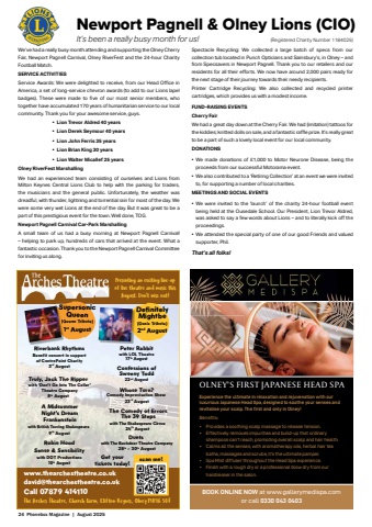 24 Phonebox Magazine | August 2025Experience the ultimate in relaxation and rejuvenation with our luxurious Japanese Head Spa, designed to soothe your senses and revitalise your scalp. The first and only in Olney! Benefits:%u2022 Provides a soothing scalp massage to release tension.%u2022 Effectively removes impurities and build-up that ordinary shampoos can%u2019t reach, promoting overall scalp and hair health.%u2022 Calms all the senses, with aromatherapy oils, herbal hair tea baths, massages and scrubs; it%u2019s the ultimate pamper.%u2022 Spa Mist diffuser throughout the Head Spa experience.%u2022 Finish with a rough dry or a professional blow dry from our hairdresser in the salon.OLNEY%u2019S FIRST JAPANESE HEAD SPABOOK ONLINE NOW at www.gallerymedispa.comor call 0330 043 0403Presenting an exciting line-up of live theatre and music this August. Don%u2019t mi%u0005 out! www.thearchestheatre.co.uk david@thearchestheatre.co.ukCall 07879 414%u008f 0 The Arches Theatre, Church Farm, Clifton Reynes, Olney MK46 5DTRiverbank Rhythms3rd AugustBenefit concert in support of CentrePoint CharityTruly, Jack The Ripperwith %u2018Don%u2019t Go Into The Cellar%u2019 Theatre CompanyRobin HoodSense & Sensibilitywith DOT ProductionsPeter Rabbit17th Augustwith LOL TheatreThe Comedy of ErrorsSupersonic Queen(Queen Tribute)1st AugustSupersonic (Queen Tribute)1DefinitelyMightbe(Oasis Tribute)2nd Augustscan me!8th AugustA Midsummer Night%u2019s DreamFrankensteinwith British Touring Shakespeare9th August10th Augustwith The Shakespeare Circus24th AugustThe 39 StepsDuetswith The Backdoor Theatre Company28th %u2013 30th AugustGet your tickets today!Comedy Improvisation Show23rd AugustWhose Turn?Confessions of Sweeny Todd%u00a5 nd AugustWe%u2019ve had a really busy month attending and supporting the Olney Cherry Fair, Newport Pagnell Carnival, Olney RiverFest and the 24-hour Charity Football Match.SERVICE ACTIVITIESService Awards: We were delighted to receive, from our Head Offi ce in America, a set of long-service chevron awards (to add to our Lions lapel badges). These were made to fi ve of our most senior members, who together have accumulated 170 years of humanitarian service to our local community. Thank you for your awesome service, guys.%u2022%u2002Lion Trevor Aldred 40 years%u2022%u2002Lion Derek Seymour 40 years%u2022%u2002Lion John Ferris 35 years %u2022%u2002Lion Brian King 30 years %u2022%u2002Lion Walter Micallef 25 yearsOlney RiverFest MarshallingWe had an experienced team consisting of ourselves and Lions from Milton Keynes Central Lions Club to help with the parking for traders, the musicians and the general public. Unfortunately, the weather was dreadful, with thunder, lightning and torrential rain for most of the day. We were some very wet Lions at the end of the day. But it was great to be a part of this prestigious event for the town. Well done, TOG.Newport Pagnell Carnival Car-Park MarshallingA small team of us had a busy morning at Newport Pagnell Carnival! %u2013 helping to park up, hundreds of cars that arrived at the event. What a fantastic occasion. Thank you to the Newport Pagnell Carnival Committee for inviting us along.Newport Pagnell & Olney Lions (CIO)Spectacle Recycling: We collected a large batch of specs from our collection tub located in Punch Opticians and Sainsbury%u2019s, in Olney %u2013 and from Specsavers in Newport Pagnell. Thank you to our retailers and our residents for all their eff orts. We now have around 2,000 pairs ready for the next stage of their journey towards their needy recipients.Printer Cartridge Recycling: We also collected and recycled printer cartridges, which provides us with a modest income.FUND-RAISING EVENTSCherry FairWe had a great day down at the Cherry Fair. We had (imitation) tattoos for the kiddies; knitted dolls on sale, and a fantastic raffl e prize. It%u2019s really great to be a part of such a lovely local event for our local community.DONATIONS%u2022%u2002 We made donations of %u00a31,000 to Motor Neurone Disease, being the proceeds from our successful Motorama event.%u2022%u2002 We also contributed to a %u2018Retiring Collection%u2019 at an event we were invited to, for supporting a number of local charities.MEETINGS AND SOCIAL EVENTS%u2022 %u2002 We were invited to the %u2018launch%u2019 of the charity 24-hour football event being held at the Ousedale School. Our President, Lion Trevor Aldred, was asked to say a few words about Lions %u2013 and to literally kick off the proceedings. %u2022%u2002 We attended the special party of one of our good Friends and valued supporter, Phil.That%u2019s all folks!It%u2019s been a really busy month for us! (Registered Charity Number 1184025)Club of the Month: Club...Two line blurbText