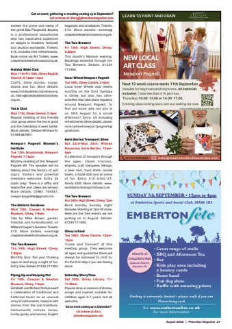 August 2025 | Phonebox Magazine 27Got an event, gathering or meeting coming up in September? Let us know at: diary@phoneboxmagazine.comevokes the grace and swing of the great Ella Fitzgerald. Boysey is a professional saxophonist who has captivated audiences on stages in theatres, festivals and studios worldwide. Tickets: %u00a315, includes free refreshments. Book online via Art Tickets. www.cowperandnewtonmuseum.org.uk.Holiday Bible ClubMon 11th-Fri 15th, Olney Baptist Church, 9.15am-12pmCrafts, bible stories, songs, drama and fun. More details: www.holidaybibleclubolney.org.uk, hilary@holidaybibleclubolney.org.uk.Tea & ChatMon 11th, Olney Centre, 2-3pmRegular meeting of this friendly chat group where the tea is good and the friendship is even better. More details: Debbie Whitworth, 07494 681907.Newport Pagnell Women%u2019s InstituteTue 12th, Brooklands, Newport Pagnell, 7.15pmMonthly meeting of the Newport Pagnell WI. The speaker will be talking about the history of pub signs. Visitors and potential members welcome. Entry %u00a35 (cash only). There is a raffl e, and tea/coff ee and cakes are served. More details: 07851 704551, newportpagnellwi@gmail.com.The Historic GardenerWed 13th, Cowper & Newton Museum, Olney, 7-9pmTalk by Mike Brown, garden historian and horticulturalist, on William Cowper%u2019s Gardens. Tickets: %u00a310. More details: events@cowperandnewtonmuseum.org.uk.The Two Brewers Thu 14th, High Street, Olney, 7.30pmMonthly Quiz. Put your thinking caps on and enjoy a night of fun. Entry: free. Details: 01234 711393.Piping Up and Harping On!Fri 15th, Cowper & Newton Museum, Olney, 7-9pmElizabeth and Richard York present a celebration of traditional and historical music on an unusual array of instruments, mixed in with stories from the oral traditions. Instruments include harps, hurdy-gurdy, and various English bagpipes and smallpipes. Tickets: %u00a310. More details: events@cowperandnewtonmuseum.org.uk.The Two Brewers Fri 15th, High Street, Olney, 6.30pmThis month%u2019s Medium evening. Bookings essential through the Two Brewers. Details: 01234 711393.Inner Wheel Newport PagnellTue 19th, Olney Centre, 2-4pmLocal Inner Wheel club meets monthly on the third Tuesday in Olney, but also has other activities that take place regularly around Newport Pagnell. To find out more, why not join in on 19th August for a social afternoon? Entry: %u00a35 including refreshments. More details: Jackie, innerwheelnewportpagnell@gmail.com.Earls Barton Transport ShowSat 23rd-Mon 25th, Whites Nurseries, Earls Barton, 10am5pmA collection of transport through the ages, steam tractors, engines, craft marquees, Vikings, a beer tent, food stalls, model boats, a trade stall and an arena of fun. Entry: %u00a310 (child %u00a37, family %u00a330). More details: www.earlsbartontransportshow.co.ukThe Two Brewers Sun 24th, High Street, Olney, 7pm Bank holiday Sunday night Karaoke. Starting at 7pm till close. Here are the free events we are putting on in August. Details: 01234 711393.Olney is KindTue 26th, Olney Centre, 10am12pm%u2018Come and Connect%u2019 at this meeting group. They welcome all ages and guarantee there will always be someone to chat to. It%u2019s the fi rst step if you are feeling alone.Saturday StoryTimeSat 30th, Olney Library, 11-11.30amPopular drop-in session of stories, songs and rhymes suitable for children ages 3-7 years, but all welcome.Got an event coming up in September? Let us know at: diary phoneboxmagazine.comSee www.embertonfete.co.uk for more informationSUNDAY 7th SEPTEMBER %u2022 12pm to 4pmat Emberton Sports and Social Club, MK46 5BS%u2022 Great range of stalls%u2022 BBQ and Afternoon Tea%u2022 Bar%u2022 Kids play area includinga bouncy castle%u2022 Brass band%u2022 Fun dog show%u2022 Raffle with amazing prizesParking is extremely limited %u2013 please walk if you can Please bring cashADULTS: %u00a32CHILDREN: FREE(optional children%u2019s play pass: %u00a33)