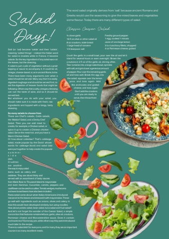 28 Phonebox Magazine | August 2025The word salad originally derives from %u2018salt%u2019 because ancient Romans and Greeks would use the seasoning to give the mixed leaves and vegetables Salad some fl avour. Today there are many diff erent types of salad. Days!Salt (or %u2018sal) became %u2018salde%u2019 and then %u2018salata%u2019, meaning %u2018salted things%u2019 %u2013 indeed the Italian word for salad is insalata while in France, it became salade. So the key ingredient of any salad was not the leaves, but the dressing. A salad is just a pile of vegetation without a great topping or sauce to accompany it. It could be oil, vinegar, cheese-based or, as in ancient Rome, brine. There have been many arguments over when a salad should be served. Many say that it is easily digested roughage and should be served fi rst, to aid the digestion of heavier foods that might be following. Others say that a salty, vinegary dressing can ruin the taste of wine, and so it should be served last.But whatever you do with your salad, you should make sure it is made with fresh, raw ingredients and topped with a tangy, tasty dressing.So many salads to choose fromThere are Chef%u2019s salads, Cobb salads, the Waldorf Salad, and a Derby Chef Salad. Then you can add meat to create, for example, a Chicken salad, or spice it up to create a Chinese chicken salad. Serve the meat hot, and you have a Warm Chicken Salad.Or how about coleslaw? That%u2019s cabbage salad, made popular by the Dutch whose words for cabbage (kool) and salad (sla) were put together to help create the popular s u m m e r s i d e dish.C r u d i te s are another fi ne way to enjoy salad items such as celery and radishes. They are sliced thinly and served with an assortment of tasty sauces from Marie Rose to Thousand Island to mayonnaise and even Hummus. Cucumber, carrots, peppers and caulifl ower can be used in crudites. Tomato wedges, mushrooms and even broad beans have also been included.Pasta salad came about when Italian Americans introduced macaroni to the leaves and dressed it with mayonnaise. These go well with ingredients such as onions, olives and celery. In Asia this would have developed similarly, but using noodles. How about potato salad, bean salad, tuna salad and fruit salad? And let%u2019s not forget the wonder of the Caesar Salad, a simple concoction that features romaine lettuce, garlic, olive oil, croutons, Parmesan cheese and Worcestershire sauce. Does it contain anchovies too? Some say yes, while others say they were introduced much later to the recipe.There is a salad dish for everyone, and for many they are an important course in so many excellent meals.Classic Caesar Salad%u00bd clove garlic16 fl oz olive or other salad oil8 oz croutons, stale bread1 large head of romaine1/4 teaspoon saltCrush the garlic in a small bowl, pour over the oil and let it stand for several hours or even overnight. Brown the croutons in 2 fl oz of the garlic oil, stirring often. Tear romaine into a large salad bowl, sprinkle with salt, and grind over a generous amount of pepper. Pour over the remaining garlic oil and toss well. Break the egg into the salad; squeeze over the lemon juice, and toss again. Add the anchovies and grated cheese, and toss again. Don%u2019t add the croutons until you are ready to serve, then throw them on top.Freshly ground pepper1 egg, cooked 1 minuteJuice of one large lemon3 to 4 anchovy fi llets, chopped4 oz Parmesan cheese, grated