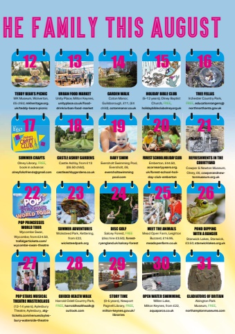 August 2025 | Phonebox Magazine 33 HE FAMILY THIS AUGUST12 13 14 15 1617 18 19 20 2122 23 24 25 2627 28 29 30 31 TEDDY BEAR%u2019S PICNICMK Museum, Wolverton, %u00a35 child, mkheritage.org.uk/teddy-bears-picnicURBAN FOOD MARKET Unity Place, Milton Keynes, unityplace.co.uk/fooddrink/urban-food-marketGARDEN WALKCoton Manor, Guilsborough, %u00a311, (%u00a34 child), cotonmanor.co.ukHOLIDAY BIBLE CLUB (5-12 years), Olney Baptist Church, FREE, holidaybibleclubolney.org.ukTREE FELLASIrchester Country Park, FREE, educationrangers@northnorthants.gov.ukSUMMER CRAFTSOlney Library, FREE, book in advance: olneyfoliofriends@gmail.comCASTLE ASHBY GARDENS Castle Ashby, from %u00a313 (%u00a36.50 child), castleashbygardens.co.ukBABY SWIMEversholt Swimming Pool, Eversholt, %u00a36, eversholtswimmingpool.comFOREST SCHOOL HOLIDAY CLUBEmberton, %u00a344.50, acornearlyyears.org.uk/forest-school-holiday-club-embertonREFRESHMENTS IN THE COURTYARDCowper & Newton Museum, Olney, %u00a36, cowperandnewtonmuseum.org.ukPOP PRINCESSES WORLD TOURWycombe Swan, Wycombe, from %u00a324.50, trafalgartickets.com/wycombe-swan-theatreSUMMER ADVENTURES Wicksteed Park, Kettering, from %u00a322, wicksteedpark.orgDISC GOLFSalcey Forest, FREE (disc hire %u00a33.50), forestryengland.uk/salcey-forestMEET THE ANIMALS Mead Open Farm, Leighton Buzzard, %u00a316.95, meadopenfarm.co.ukPOND DIPPING WITH A RANGERStanwick Lakes, Stanwick, %u00a33.50, stanwicklakes.org.ukPOP STARS MUSICAL THEATRE MASTERCLASS (12-14 years), Aylesbury Theatre, Aylesbury, atgtickets.com/venues/aylesbury-waterside-theatreGUIDED HEALTH WALKHarrold Odell Country Park, FREE, harroldhealthwalk@outlook.comSTORY TIME (0-5 years), Newport Pagnell Library, FREE, milton-keynes.gov.uk/librariesOPEN WATER SWIMMING, Willen Lake, Milton Keynes, from %u00a322, aquaparcs.co.ukGLADIATORS OF BRITAINAbington Park Museum, FREE, northamptonmuseums.com