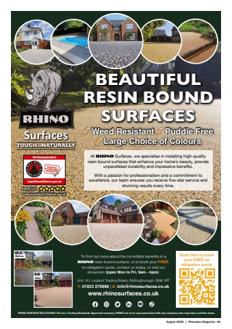August 2025 | Phonebox Magazine 45BEAUTIFUL RESIN BOUNDSURFACESRHINO SURFACE SOLUTIONS LTD are a Trading Standards Approved company. RHINO are in no way associated with any company who may have a similar name.To find out more about the incredible benefits of a Rhino resin bound surface, or to book your FREE, no obligation quote, contact us today, or visit our showroom (open Mon to Fri, 9am - 4pm).Unit 141, Leyland Trading Estate, Wellingborough, NN8 1RT T: 01933 276998 | E: info@rhinosurfaces.co.uk www.rhinosurfaces.co.ukScan here to book your FREE no obligation quoteRated 5/5www.buywithconfidence.gov.ukAt Rhino Surfaces, we specialise in installing high-quality resin bound surfaces that enhance your home%u2019s beauty, provide unparalleled durability and impressive benefits. With a passion for professionalism and a commitment to excellence, our team ensures you receive five-star service and stunning results every time.3 Weed Resistant 3 Puddle Free 3 Large Choice of ColoursBeforeAfter