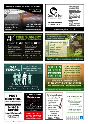46 Phonebox Magazine | August 2025CALL US FOR A FREE QUOTATION 01908 616 112 or 01234 713 843 www.mk-fencing.co.uk %u2022 mk1fencing@aol.comMILTONKEYNESFENCINGLIMITEDOsbournes Farm, Newport Road, Emberton, MK46 5JDFor All Your Fencing, Decking and Sheds in Olney, Milton Keynes & Surrounding Areas A small family run business with over 25 years experienceAll Types of Fencing & Gates %u2022 DeckingPatios & Groundworks %u2022 Stump GrindingMAXFENCING07791 369709maxfencing@yahoo.com MaxFencing%u2022 Pruning, Hedgecutting, Leylandii reduction%u2022 Turfi ng & Planting%u2022 Patio Cleaning & Restoration%u2022 Fencing, Trellising & Fence repair%u2022 Bespoke log storesTaylor LandscapesPlease call Justin for a quote07816 097 79701234 714 634Leylandii reduction%u2022 Turfi ng & Planting%u2022 Fencing, Trellising TREE SURGERYSTUMP GRINDING & HEDGE MAINTENANCE01908 049955 %u2022 07731 467078www.monettreecare.co.uk %u2022 info@monettreecare.co.uk%u2022 Tree Removals%u2022 Crown Reductions%u2022 Removing Deadwood%u2022 Pollarding%u2022 Hedge Maintenance%u2022 Fruit Tree Pruning%u2022 Stump Removals%u2022 Cable Bracing%u2022 Dealing with dangeroustrees or storm damagePESTCONTROL %u201cAnts to Elephants%u201dRENTAKEEPER01 90 8510189www.killem.co.ukLocal, ReliableFully InsuredOffering all aspects of landscaping from maintenance to complete re-landscapingOffice: 01234 240430 Mobile: 07515 632666sjr@richardsonlandscapes.comFencing, Fence repairs and painting, Hedging, Turfing, Re-pointingFully InsuredB Gibbs Garden Maintenance01933 412 62107707 687 095bgibbs981@gmail.comADRIAN WORLEY LANDSCAPINGFencing, Paving & Driveways 01234 714 887 07500 042 686E: worley60@btinternet.com 35 Years Experience Based Locally15 Northampton Rd, LavendonSee me on Trust a Trader websiteCall 07508 519213 or email: jadonetti@outlook.comJAD Professional Garden & Horticulture ServicesNo obligation estimatesWE OFFER:Full Range of Lawn CarePruningPlantingGarden ClearanceHedging / CuttingTopiaryJet WashingWeed Control