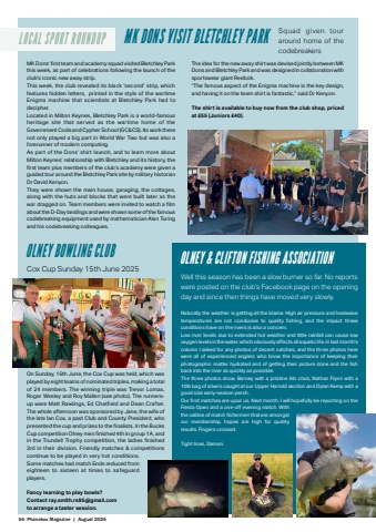 54 Phonebox Magazine | August 2025LOCAL SPORT ROUNDUP OLNEY BOWLING CLUBCox Cup Sunday 15th June 2025On Sunday, 15th June, the Cox Cup was held, which was played by eight teams of nominated triples, making a total of 24 members. The winning triple was Trevor Lomax, Roger Wesley and Roy Mallen (see photo).%u00a0The runnersup were Matt Rawlings, Ed Chatfi eld and Dean Crafter. The whole afternoon was sponsored by Jane, the wife of the late Ian Cox, a past Club and County President, who presented the cup and prizes to the fi nalists. In the Bucks Cup competition Olney men fi nished 4th in group 1A, and in the Trundell Trophy competition, the ladies fi nished 3rd in their division. Friendly matches & competitions continue to be played in very hot conditions. Some matches had match Ends reduced from eighteen to sixteen at times to safeguard players.Fancy learning to play bowls? Contact ray.smith.rs95@gmail.com to arrange a taster session.MK DONS VISIT BLETCHLEY PARK OLNEY & CLIFTON FISHING ASSOCIATIONWell this season has been a slow burner so far. No reports were posted on the club%u2019s Facebook page on the opening day and since then things have moved very slowly. Naturally the weather is getting all the blame. High air pressure and heatwave temperatures are not conducive to quality fi shing, and the impact these conditions have on the rivers is also a concern.%u00a0Low river levels due to extended hot weather and little rainfall can cause low oxygen levels in the water, which obviously aff ects all aquatic life. In last month%u2019s column I asked for any photos of decent catches, and the three photos here were all of experienced anglers who know the importance of keeping their photographic matter hydrated and of getting their picture done and the fi sh back into the river as quickly as possible.The three photos show, Barney with a pristine 5lb chub, Nathan Flynn with a 10lb bag of silvers caught at our Upper Harrold section and Dylan Kemp with a good size early-season perch.Our fi rst matches are upon us. Next month, I will hopefully be reporting on the Fiesta Open and a one-off evening match. With the calibre of match fi shermen that are amongst our membership, hopes are high for quality results. Fingers crossed. Tight lines, Damon.Squad given tour around home of the codebreakersMK Dons%u2019 fi rst team and academy squad visited Bletchley Park this week, as part of celebrations following the launch of the club%u2019s iconic new away strip.This week, the club revealed its black %u2018second%u2019 strip, which features hidden letters,%u00a0 printed in the style of the wartime Enigma machine that scientists at Bletchley Park had to decipher.%u00a0Located in Milton Keynes, Bletchley Park is a world-famous heritage site that served as the wartime home of the Government Code and Cypher School (GC&CS). Its work there not only played a big part in World War Two but was also a forerunner of modern computing.As part of the Dons%u2019 shirt launch, and to learn more about Milton Keynes%u2019 relationship with Bletchley and its history, the fi rst team plus members of the club%u2019s academy were given a guided tour around the Bletchley Park site by military historian Dr David Kenyon.They were shown the main house, garaging, the cottages, along with the huts and blocks that were built later as the war dragged on. Team members were invited to watch a fi lm about the D-Day landings and were shown some of the famous codebreaking equipment used by mathematician Alan Turing and his codebreaking colleagues.The idea for the new away shirt was devised jointly between MK Dons and Bletchley Park and was designed in collaboration with sportswear giant Reebok.%u00a0%u201cThe famous aspect of the Enigma machine is the key design, and having it on the team shirt is fantastic,%u201d said Dr Kenyon.The shirt is available to buy now from the club shop, priced at %u00a355 (Juniors %u00a340).