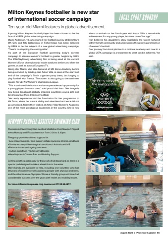 August 2025 | Phonebox Magazine 55LOCAL SPORT ROUNDUPA young Milton Keynes football player has been chosen to be the face of a UEFA global advertising campaign.%u00a0Miami Anderson, 10, who started her football journey at Bletchley%u2019s MK City and MK Gallacticos in Fishermead, has been selected by UEFA to be the subject of a new global advertising campaign, %u2018There%u2019s no stopping the unstoppable%u2019.It%u2019s part of the European football governing body%u2019s six-year campaign to elevate women%u2019s football to greater heights by 2023. The #WePlayStrong advertising fi lm is being aired at the current Women%u2019s Euros championship inside stadiums before and after the games, as well as across European TV.%u00a0Rising star Miami, who also featured at MK Dons Academy before being recruited by leading club Aston Villa, is seen at the start and end of the campaign%u2019s fi lm in a garden party dress, but longing to play football with friends. The advert is also going to be used next season for UEFA%u2019s Women%u2019s Champions League.%u201cThis is an incredible honour and an unprecedented opportunity for a young player from our town,%u201d said proud dad Ivan. %u201cHer image is now being broadcast globally, inspiring countless young girls and boys to pursue their dreams in football.%u201cHer early experience laid the foundation for her progression to MK Dons, where her natural ability and relentless hard work did not go unnoticed. Miami then trialled at Aston Villa Women%u2019s Academy, one of the most prestigious academies in the country. She is now Milton Keynes footballer is new star of international soccer campaignTen-year-old Miami features in global advertisement.about to embark on her fourth year with Aston Villa, a remarkable achievement for any young player, let alone one of her age.%u201dIvan believes his daughter%u2019s story highlights the talent nurtured within the MK community and underscores the growing prominence of women%u2019s football.%u00a0%u201cHer journey from local pitches to a national academy and now to a global UEFA campaign is a testament to what can be achieved,%u201d he said.NEWPORT PAGNELL ASSISTED SWIMMING CLUB The Assisted Swimming Club meets at Middleton Pool, Newport Pagnell every Monday and Friday afternoon from 2.30 to 3.30pm.The group provides tailored support for:%u2022 Low impact exercise / post-surgery rehab, injuries or chronic conditions %u2022 Stroke recovery / Neurological conditions / Arthritis and MS %u2022 Balance issues and ageing concerns %u2022 Autism Spectrum / Parkinson%u2019s Disease %u2022 Head injuries / Chronic Pain and Mobility SupportGetting into the pool is easy for those who fi nd steps hard, as there is a special pod designed to take a wheelchair in the water.Many hands are available to help, including one volunteer who has 30 years of experience with assisting people with physical problems, and the other is an ex-Olympian. We are a friendly group and have had considerable success over the years with health and mobility issues.For more information please ring Joanne on 07742 694817.