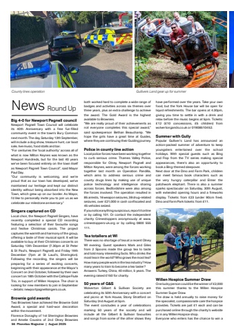 56 Phonebox Magazine | August 2025Big 4-0 for Newport Pagnell councilNewport Pagnell Town Council will celebrate its 40th Anniversary with a free fun-fi lled community event in the town%u2019s Bury Common next month. The day, Saturday 13th September, will include a dog show, treasure hunt, car boot sale, live music, food stalls and bar.%u00a0%u201cFor centuries the %u2018local authority%u2019 across all of what is now Milton Keynes was known as the Newport Hundreds, but for the last 40 years we%u2019ve been focused entirely on the town itself as Newport Pagnell Town Council%u201d, said Mayor Paul Day.%u201cOur community is welcoming, and we%u2019re proud that as our town has developed, we%u2019ve maintained our heritage and kept our distinct identity without being absorbed into the New Town, which grew up on our border. As Mayor, I%u2019d like to personally invite you to join us as we celebrate our milestone anniversary.%u201dSingers captured on CDLocal choir, the Newport Pagnell Singers, have recently completed a special CD recording featuring a selection of their favourite songs and festive Christmas carols. The project captures the warmth and harmony of the group, off ering a taste of their musical spirit. It will be available to buy at their Christmas concerts on Saturday 13th December (7.30pm at St Peter & St Paul%u2019s, Newport Pagnell) and Friday 19th December (7pm at St Laud%u2019s, Sherington). Following the recording, the singers will be preparing for a series of exciting concerts, beginning with their appearance at the Mayor%u2019s Concert on 2nd October, followed by their own concert on 18th October with the Calliope Flute Trio, in support of Willen Hospice. The choir is looking for new members to join in September %u2013 details: newportpagnellsingers.co.uk.Brownie gold awardsTwo Brownies have achieved the Brownie Gold Award, a special and hard-won decoration within the movement. Florence Donaghy of 1st Sherington Brownies and Amelie Cousins of 2nd Olney Brownies have performed over the years. Take your own food, but the York House bar will be open for liquid refreshments. The bar opens at 4.30pm, giving you time to settle in with a drink and relax before the music begins at 5pm. Tickets: %u00a312 (%u00a310 concessions, %u00a35 children) from wolvertongands.co.uk or 01908510452.Summer with GullyPopular Gulliver%u2019s Land has announced an action-packed summer of adventure to keep youngsters entertained over the school holidays. With special guests such as Bing and Flop from the TV series making special appearances, there%u2019s also an opportunity to book a Bing-themed sleepover. Next door at the Dino and Farm Park, children can meet famous book characters such as the very hungry caterpillar and Elmer the patchwork elephant. There is also a summer sparks spectacular on Saturday, 30th August, with extended opening hours and a fi reworks display. Tickets: from %u00a323 (under 90cm free). Dino and Farm Park tickets: from %u00a311.Willen Hospice Summer DrawOne lucky person could be the winner of %u00a32,000 this summer thanks to the Willen Hospice Summer Super Draw.The draw is held annually to raise money for the specialist, compassionate care the hospice provides. Tickets are just %u00a31 each and can be purchased online through the charity%u2019s website or in any Willen Hospice shop.%u00a0Everyone who enters has the chance to win a both worked hard to complete a wide range of badges and activities across six themes over three years, plus an extra challenge to achieve the award. The Gold Award is the highest available to Brownies.%u201cWe are really proud of their achievements as not everyone completes this special award,%u201d said spokesperson Bethan Beauchamp. %u201cWe hope the girls have a great time at Guides, where they are continuing their Guiding journey.Police in county line actionLocal police forces have been working together to curb serious crime. Thames Valley Police, responsible for Olney, Newport Pagnell and Milton Keynes, were among the forces working together last month on Operation Pandilla, which aims to address serious crime and county drugs lines by making use of unique police technology and intelligence sharing across forces. Bedfordshire were also among the forces involved. The operation resulted in 85 arrests, 16 weapon seizures, 38 drug-related seizures, over %u00a321,000 in cash confi scated and 45 vehicles seized.If you notice anything suspicious, report it online or by calling 101. Or contact the independent charity Crimestoppers anonymously at www.crimestoppers-uk.org or by calling 0800 555 111.Tea totallers at WI There was no shortage of tea at a recent Olney WI evening. Guest speakers Mark and Giles from 2 Spoons made the group tea to taste and told many interesting facts. Who drinks the most tea in the world? Who grows the most tea? How many people work in the tea industry? How many years to train to become a tea taster?Answers: Turkey, China, 40 million, 5 years. The evening raised %u00a3150 for charity.50 years of G&SWolverton Gilbert & Sullivan Society are celebrating its 50th Anniversary with a concert and picnic at York House, Stony Stratford on Saturday 2nd August at 5pm. The event concludes a year of celebrations marking 50 years of the society and will include all the Gilbert & Sullivan favourites and songs from some of the other shows they News Round UpCounty lines operation Gullivers Land gear up for summer