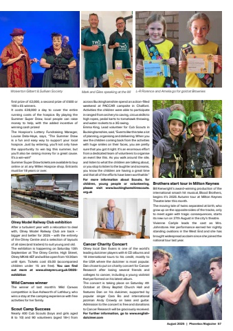 August 2025 | Phonebox Magazine 57Wolverton Gilbert & Sullivan Society Mark and Giles speaking at the WI L-R Florence and Amelia go for gold at Browniesfi rst prize of %u00a32,000, a second prize of %u00a3500 or 100 x %u00a35 winners.It costs %u00a328,000 a day to cover the entire running costs of the hospice. By playing the Summer Super Draw, local people can raise money to help, with the added incentive of winning cash prizes!The Hospice%u2019s Lottery Fundraising Manager, Louise Dela-Haye, says, %u201cThe Summer Draw is a fun and easy way to support your local hospice. Just by entering, you%u2019ll not only have the opportunity to win big this summer, but you%u2019ll also be raising money for a great cause. It%u2019s a win-win!%u201dSummer Super Draw tickets are available to buy online or at any Willen Hospice shop. Entrants must be 18 years or over. Olney Model Railway Club exhibition After a turbulent year with a relocation to deal with, Olney Model Railway Club are back %u2013 bigger and better for 2025 %u2013 with the entirety of the Olney Centre and a selection of layouts of all sizes (and traders) to suit young and old.The exhibition is happening on Saturday 13th September at The Olney Centre, High Street, Olney MK46 4EF and will be open from 10:30am until 4pm. Tickets cost %u00a35.00 (accompanied children under 15 are free). You can fi nd out more at www.olneymrc.org.uk/2025-exhibitionWild Canvas winnerThe winner of last month%u2019s Wild Canvas competition is Sue Ashworth of Lathbury, who wins a stay at the camping experience with free activities for her family. Scout Camp SuccessNearly 400 Cub Scouts (boys and girls aged 8 to 10) and 90 volunteers (aged 18+) from across Buckinghamshire spend an action-fi lled weekend at PACCAR campsite in Chalfont. Activities the children were able to participate in ranged from archery to caving, circus skills to high ropes, pedal karts to tomahawk throwing, and water rockets to a 3G swing.Emma King, Lead volunteer for Cub Scouts in Buckinghamshire, said, %u201cEvents like this take a lot of planning, organising and delivering. When you see the children coming back from the activities with huge smiles on their faces, you are pretty sure that you got it right. It%u2019s an enormous eff ort from a dedicated team of volunteers to organise an event like this. As you walk around the site, and listen to what the children are talking about, or you stop to listen to the laughter and screams, you know the children are having a great time and that all of the eff orts have been worthwhile.%u201dFor more information about Scouts, for children, young people or volunteering, please visit www.buckinghamshirescouts.org.ukCancer Charity ConcertOlney local Dan Evans is one of the world%u2019s leading dulcimer players with 6 CD albums and 18 international tours to his credit, mostly to the USA where the dulcimer is most popular. Dan chose to put on charity concert for Cancer Research after losing several friends and colleges to cancer, including a young violinist that performed on his latest album. The concert is taking place on Saturday 4th October at Olney Baptist Church Hall and features Dan on his dulcimer, supported by popular singer Cara Bo and international jazzman Andy Crowdy on bass and guitar.Admission to the concert is free and donations to Cancer Research will be graciously received. For further information, go to www.englishdulcimer.comBrothers start tour in Milton KeynesBill Kenwright%u2019s award-winning production of the international smash hit musical, Blood Brothers, begins it%u2019s 2025 Autumn tour at Milton Keynes Theatre later this month.The moving tale of twins separated at birth, who grow up on the opposite sides of the tracks, only to meet again with tragic consequences, starts its new run on 27th August in the city%u2019s theatre. Vivienne Carlyle leads the cast as Mrs. Johnstone. Her performance earned her nightly standing ovations in the West End and she has brought widespread acclaim since she joined the national tour last year.