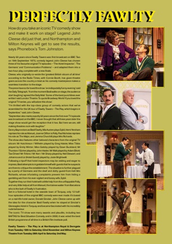 12 Phonebox Magazine | September 2025 Nearly 50 years since Fawlty Towers was fi rst broadcast on BBC Two on 19th September 1975, comedy legend John Cleese has chosen three of his favourite original TV episodes %u2013 %u2018The Hotel Inspector%u2019, %u2018The Germans%u2019 and %u2018Communication Problems%u2019 %u2013 and adapted them into a two-hour play, complete with a new fi nale. Cleese, who originally co-wrote the %u2018greatest British sitcom of all time%u2019 according to the Radio Times, with Connie Booth, has given theatre goers across the country a treat as his comedy masterpiece makes a seamless transition to the stage.The press have so far loved the sho %u2018an indisputably funny evening%u2019 said the Daily Telegraph, %u2018from the moment Basil walks on stage, the audience start laughing%u2019 agreed the Daily Mail. %u2018Some of the best punchlines ever written%u2019 said London Theatre. To quote Broadway World %u2018if you loved the original TV series, you will adore this show%u2019.%u201cI%u2019m thrilled with the top-class group of comedy actors that we%u2019ve assembled for the UK tour of Fawlty Towers %u2013 The Play, which begins in September,%u201d said John Cleese.%u201cSeptember also marks exactly 50 years since the fi rst ever TV episode was broadcast on the BBC. I never thought that all these years later the stage show would get the reception that it has. But here we are, still making theatres rock with laughter.%u201dDanny Bayne stars as Basil Fawlty, Mia Austen plays Sybil, Hemi Yeroham reprises his role as Manuel, Joanne Clifton is Polly, Paul Nicholas reprises his role as The Major, and Jemma Churchill plays Mrs Richards. The show also features other beloved characters from the original TV sitcom: Mr Hutchinson / Wilhelm played by Greg Haiste; Miss Tibbs played by Emily Winter; Miss Gatsby played by Dawn Buckland; Mr Thurston / G%u00fcnter played by John Hasler; Mr Walt played by Adam Elliott; Taxi Driver/ Mr Firkins / Mr Kerr / Mr Sharp played by Neil Stewart; and Johanna and Liz (Hotel Guest) played by Josie Brightwell. Following a tipoff that hotel inspectors may be visiting and eager to impress, Basil attempts to ingratiate himself with guests that he suspects are there to critique the establishment. The situation is further plagued by a party of Germans and the deaf and dotty guest-from-hell Mrs Richards, whose infuriating complaints prevent him from hiding a gambling win from his ever-vigilant and bossy wife, Sybil. Together they run their hotel with a little help from the unfl appable Polly, and very little help at all from Manuel, the trainee waiter from Barcelona who is the butt of Fawlty%u2019s frustration.Set in a fi ctional hotel in the seaside town of Torquay, only 12 halfhour episodes of the original BBC comedy were ever made. It%u2019s based on a real-life hotel owner, Donald Sinclair. John Cleese came up with the idea for the character Basil Fawlty when he stayed at Sinclair%u2019s Gleneagles Hotel in Torquay and became fascinated with his incredibly rude behaviour.The iconic TV show won many awards and plaudits, including two BAFTAS for Best Situation Comedy, and in 2000, it was voted the best British programme of all time in a British Film Institute poll.Fawlty Towers %u2013 The Play is at Northampton Royal & Derngate from Tuesday 18th to Saturday 22nd November and Milton Keynes Theatre from Tuesday 28th April to Saturday 2nd May.How do you take an iconic TV comedy show and make it work on stage? Legend John Cleese did just that, and Northampton and Milton Keynes will get to see the results, says Phonebox%u2019s Tom Johnston.PERFECTLY FAWLTY PERFECTLY FAWLTY