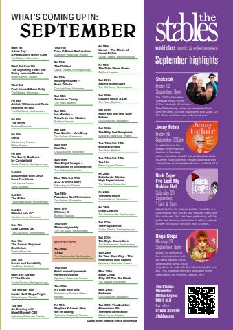 September 2025 | Phonebox Magazine 13 Dates might change: check with venueWHAT%u2019S COMING UP IN:SEPTEMBERMon 1stAdam Kay: A Particularly Nasty CaseThe Stables, WavendonWed 3rd-Sun 7thThe Lightning Thief: The Percy Jackson MusicalMilton Keynes TheatreWed 3rdPaul Jones & Dave KellyThe Stables, WavendonFri 5thAlistair Williams and Tania Edwards on tourThe Old Savoy, NorthamptonFri 5thThe Me%u0084 sBedford EsquiresFri 5thOasizStantonbury Theatre, Milton KeynesFri 5thThe Everly Brothers by CandellightCastle Theatre, Wellingborough Sat 6thAutumn Bal with Deux Sans Fronti%u00e8resYork House Centre, Stony StratfordSat 6thThe Rifl esThe Roadmender, NorthamptonSat 6thWhole Lotta DCCraufurd Arms, WolvertonSun 7thLuke Combs UKThe Old Savoy, NorthamptonSun 7thThe Annual Esquires BeatleJamBedford EsquiresSun 7thSense and SensibilityThe Place, BedfordMon 8th-Tue 9thF1 The MovieCastle Theatre, Wellingborough Tue 9th-Sat 13thInside No 9 Stage/FrightMilton Keynes TheatreTue 9thAn Evening with Nigel Mansell CBEAylesbury Waterside TheatreThu 11thDara O Briain Re:CreationAylesbury Waterside TheatreFri 12thThe DriftersCastle Theatre, Wellingborough Fri 12thMoving Pictures %u2013 Rush TributeCraufurd Arms, WolvertonSat 13thAmerican CandyThe Place, BedfordSat 13thIon Maiden %u2013 Tribute to Iron MaidenBedford EsquiresSat 13thPaul Zerdin %u2013 Jaw-DropThe Stables, WavendonSun 14thKoo KooCraufurd Arms, WolvertonSun 14thThis Flight Tonight %u2013 The Songs of Joni MitchellThe Stables, WavendonMon 15th-Sat 20th2:22 A Ghost StoryMilton Keynes TheatreTue 16thPasadena Roof OrchestraThe Stables, WavendonWed 17thWhitney KBedford EsquiresThu 18thShowaddywaddyThe Old Savoy, NorthamptonEDITOR%u2019S PICKThu 18thT%u2019PauThe Roadmender, NorthamptonThu 18thRob Lamberti presents Perfectly GeorgeAylesbury Waterside TheatreThu 18thNT Live: Inter AliaStantonbury Theatre, Milton KeynesFri 19thStephen K Amos: Now We%u2019re TalkingAylesbury Waterside TheatreFri 19thLionel %u2013 The Music of Lionel RichieCastle Theatre, Wellingborough Fri 19thThe Total Stone RosesBedford EsquiresSat 20thSaving All My LoveThe Old Savoy, NorthamptonSat 20thCaught You In A Lie!The Place, BedfordSat 20thPeter and the Test Tube BabiesCraufurd Arms, WolvertonSat 20thThe Billy Joel SongbookAylesbury Waterside TheatreTue 23rd-Sat 27thBlood BrothersThe Place, BedfordTue 23rd-Sat 27thTop HatMilton Keynes TheatreFri 26thBabatunde Aleshe: High ExpectationsThe Stables, WavendonFri 26thThe New RosesCraufurd Arms, WolvertonFri 26thCraig CharlesThe Roadmender, NorthamptonSat 27thThe Floyd E%u0084 ectCastle Theatre, Wellingborough Sat 27thThe Style CouncillorsThe Roadmender, NorthamptonSun 28thGo Your Own Way %u2013 The Fleetwood Mac LegacyAylesbury Waterside TheatreMon 29thBaga Chipz: Chip O%u0084 The Old BlockThe Stables, WavendonMon 29thParliamoCraufurd Arms, WolvertonTue 30th-Thu 2nd OctRiverdance 30: The New GenerationMilton Keynes TheatreThe StablesWavendonMilton KeynesMK17 8LU Box office: 01908 280800stables.orgworld class music & entertainmentSeptember highlightsShakatakFriday 12 September, 8pmThe 1980%u2019s hitmakers Shakatak return to one of their favourite UK venues. They%u2019ll be playing songs you remember from over the years such as Night Birds and Down On The Street and also new material as well.Jenny %u00c9clair Friday 19 September, 7.30pmIn celebration of the release of her hilarious memoir of the same name, comedian, novelist and professional showoff Jenny %u00c9clair comes to venues nationwide with a brand-new autobiographical show. (suitable 14+)Nick Cope: I%u2019ve Lost My Bobble HatSaturday 20 September, 11am & 2pmHelp Nick find his beloved bobble hat in this fun filled musical hour with all your favourite Nick Cope hits and more. Nick has been performing with his guitar and stunning animations to sell-out crowds all over the country for more than 10 years.Baga ChipzMonday 29 September, 8pmExpect an evening of live vocals, packed with big band ballads, disco classics and songs you%u2019d sing down the pub with the nation%u2019s number one tart. Plus a special segment dedicated to her dear friend The Vivienne. (strictly 16+!)