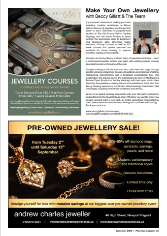 September 2025 | Phonebox Magazine 15andrew charles jeweller 46 High Street, Newport Pagnell01908 613534 | info@andrewcharlesjeweller.co.uk | www.andrewcharlesjeweller.co.uk PRE-OWNED JEWELLERY SALE!from Tuesday 2nduntil Saturday 13thSeptemberIndulge yourself for less with massive savings at our biggest-ever pre-owned jewellery event20%%u201350% off diamond rings, pendants, earrings,pearls, and moreModern, contemporary and traditional stylesGenuine reductionsLimited time onlyPrices from %u00a3100Make Your Own Jewellery with Beccy Gillatt & The TeamIf you%u2019ve ever dreamed of making your own jewellery, creative workshops at Beccy Gillatt%u2019s School of Jewellery are the perfect place to start. Delivered in purpose-built studios at The Old School Hall in Yardley Hastings and the North Pavilion in Great Linford, the workshops cater to beginners and improvers alike. One-hour taster sessions, full-day courses as well as 5-7 week courses and private sessions are available for those looking to explore jewellery-making in more depth.Courses are led by Beccy and her team of experienced tutors - each a professional jeweller in their own right, with visiting experts running specialist sessions throughout the year.Couples looking to tie the knot can also craft their own rings through private sessions including a design consultation, professional finishing, hallmarking, refreshments, and a keepsake presentation box. This September, the school opens the workshops (as part of Northants & Rutland Open Studios) in Yardley Hastings, with two open studio days featuring free jewellery-making demos and exhibitions. You%u2019ll also find Beccy hosting sessions at the Great Linford Heritage Celebration (Sat 14th Sept), including free hands-on tasters and demos. Beccy is an award-winning silversmith with over 20 years%u2019 experience and an MA from the Royal College of Art. Whether you want to meet new people, unwind, learn a new skill, or create something meaningful by hand, these sessions are creative, calming and confidence-boosting.Book your place at: www.beccygillatt.com/coursescourses@beccygillatt.com | 07818 406 926