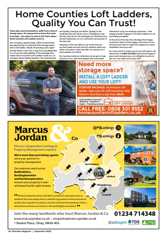 16 Phonebox Magazine | September 2025MJLettings@MJLettingsOlney%u2019s independent Lettings & Property Management expertsWe%u2019re more than just letting agents;we%u2019re your partners in property management. Our extensive reach across Bedfordshire, Buckinghamshire and Northamptonshireensures your property is seen and leased by the right tenants. We have valued the service with Marcus Jordan for many years now, as landlords they have always been on hand for any queries we have had and act quickly when required. It is always a smooth and hassle free experience when a tenant leaves and new one moves in. We would highly recommend.NorthamptonNewport PagnellMilton KeynesAmpthillBedfordJoin the many landlords who trust Marcus Jordan & Co 01234 714348www.marcusjordan.co.uk %u2022 enquiries@marcusjordan.co.uk1 Market Place, Olney, MK46 4EA%u2022 Loft Ladders %u2022 Hatches %u2022 Boarding %u2022 Insulation %u2022 Lights %u2022 Fully GuaranteedSTARTER PACKAGE: Aluminium loft ladder, light plus 50 sqft boarding, fully fitted in less than a day from %u00a3355Need more storage space?STARTER PACKAGE Aluminium loft INSTALL A LOFT LADDER AND USE YOUR LOFT!CALL FREE: 0808 301 9552These days most homeowners suffer from a lack of storage space. So many precious items that need to be kept %u2013 but where to store it all? That%u2019s where Home Counties Loft Ladders come in. The company, based locally, offers homeowners the opportunity to maximise their storage space with a loft ladder, 50sqft of boarding and a light - all fully fitted in less than a day from just %u00a3444! But it%u2019s not just the affordability of the package that makes Home Counties Loft Ladders stand out, as manager Jamie Oakley explains: %u2018Our watchwords are Quality, Integrity and Value. Quality in the materials that we use for all our installations and the fact that all our loft packages are fitted by time served tradesmen, so our customers are assured of the best job. Integrity in that we will turn up at the time we say and make sure the house is spotless when we leave, and value in that we offer our services at a price people can afford. Our business relies on referrals and we get a huge amount of our calls from people who have been referred to us by our existing customers - that simply wouldn%u2019t happen if we didn%u2019t adhere to our overriding principles. At the end of the day the old adage that happy customers lead to more happy customers is true and we work hard to make that happen for every installation we carry out!%u2019 So, if you want to make use of your loft space, call Jamie free on 0808 301 9552 and he%u2019ll be happy to pop round and give you a no obligation quote so you too can make use of your loft!Home Counties Loft Ladders, Quality You Can Trust!%u00a3444