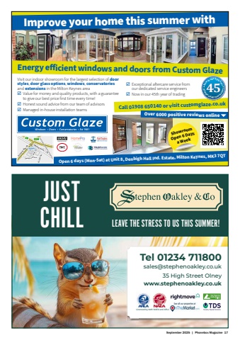 September 2025 | Phonebox Magazine 17Registered CompanyOpen 6 days (Mon-Sat) at Unit 8, Denbigh Hall Ind. Estate, Milton Keynes, MK3 7QTDenbigh Hall Drive Denbigh Hall DriveWatling Street V4Standing Way H8 A421 A5Denbigh Hall Denbigh HallWhaddon WayOver 6000 positive reviews online ShowroomOpen 6 Days a WeekImprove your home this summer withEnergy efficient windows and doors from Custom GlazeNowinour45thYearof improving your home45 sCall 01908 650140 or visit customglaze.co.ukVisit our indoor showroom for the largest selection of door styles, door glass options, windows, conservatoriesand extensions in the Milton Keynes area%uf0fe Value for money and quality products, with a guarantee to give our best price first time every time!%uf0fe Honest sound advice from our team of advisors %uf0fe Managed in-house installation teams %uf0fe Exceptional aftercare service from our dedicated service engineers%uf0fe Now in our 45th year of tradingLicensed by both NAEA and ARLATel 01234 711800sales@stephenoakley.co.uk35 High Street Olneywww.stephenoakley.co.ukJUSTCHILL LEAVE THE STRESS TO US THIS SUMMER!