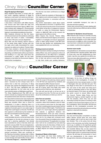 18 Phonebox Magazine | September 2025The CranesNever sign a blank cheque was what I was taught when I received my fi rst cheque book. But it seems that is what the community of Olney did when they agreed the Neighbourhood Plan in 2017. This has been highlighted with the planning application for the crane site on the new industrial estate on Wellingborough Road. The Olney Neighbourhood Plan (NP) did not need to include any employment land, but when the questionnaires were returned, it showed that the respondents wanted some new employment areas in the town, so the fi eld on Wellingborough Road was included. When land is zoned for employment, it is given a planning class or a number of planning classes, and in this case, the neighbourhood plan gave it a very wide range of things that could happen on the site. The NP was then agreed in a referendum by the residents of the town and adopted as planning policy.%u00a0When the cranes appeared, people understandably became concerned about what would happen on the site, but unknown to many was that a planning application had already been submitted for units on that site, which was granted in January 2025. The second application, which many objected to which was determined at the Planning Committee in August was merely to change the buildings that had already been granted permission. What was confi rmed at the Planning Committee meeting held in Milton Keynes in August was that the proposed uses as a crane storage and repair facility and as a place for manufacturing precast concrete products fi t within the scope of the planning classes agreed in the NP that was approved by residents and then adopted by Milton Keynes Council.%u00a0This application was agreed by the committee, with all in favour apart from Keith, who voted against and the Chairman, who abstained.The units will now be built, so all we can do is learn lessons from this. The fi rst one, be careful about the ramifi cations of what you vote for.Solar Farm at LavendonPeter attended a packed Horseshoe pub in Lavendon, where local residents came to listen to the concerns some have for the large solar farm that is seeking planning permission behind the petrol station at Warrington. That fi eld is only one part of a much larger planning application that extends a signifi cant distance into Northamptonshire. There are many concerns, and these include the way this may increase the fl ood risk for the village with increased runoff from the panels if they are installed, which we are also concerned about. The application is so large that it will not be considered by local planning authorities but by the Secretary of State via the Planning Inspectorate, so local councils such as Milton Keynes are merely consultees in this process.Dumping of Waste in SheringtonWe are aware and have been dealing with a situation of illegal dumping of waste in Sherington. At the time of writing, things are moving fast in this investigation. A number of articulated lorries have dumped waste in a fi eld in Sherington that was sold late last year. This was illegal as there were no permissions to do this, and some of this waste was being burnt as well as potentially buried on the site. When we became aware of the issue, we worked with the parish council to ensure Milton Keynes City Council, Thames Valley Police and the Environment Agency worked together to deal with the situation, which they now are and eventually involved the police in arresting a male on behalf of the Environment Agency as part of the investigation. More information will become available as this investigation proceeds, but please be assured that all authorities are working together to deal with the situation.Growth of Milton KeynesThe next and fi nal public consultation on where Milton Keynes should grow has once again been delayed, with it now not due to start until late October. This is the policy that will show where, in the rural areas, any further housing will have to go, in addition to the signifi cant growth proposed between Newport Pagnell, Chicheley and Cranfi eld. Before that, we also expect the details of where the %u2018New Town%u2019 in Milton Keynes will be located, which is a government-proposed scheme. We will keep all communities in touch with any developments in this column and through other channels as things progress.Olney Ward Councillor Corner CONTACT DEBBIE:Tel: 07494 681907 / debbie.whitworth@miltonkeynes.gov.ukMy Ward surgeries are every Tuesday, 10am-12pm at the Olney Centre. No need to book, just pop along.Cllr Debbie WhitworthOlney Ward Councillor CornerCllr Keith McLean Cllr Peter GearyCONTACT US: Keith: 07983 456081 keith.mclean@milton-keynes.gov.uk :: Peter: 07774 939404 peter.geary@milton-keynes.gov.ukIllegal fl y tipping in SheringtonMany residents have been in contact with me last month regarding sightings of illegal fl y tipping on a vast scale. I can assure you that your concerns have been acted upon by Sherington Parish and Ward CouncilsI have been in discussions with Milton Keynes City Council, who have made site visits and contacted the Environment Agency. MKCC have been working with colleagues in Environmental Crime, but due to the volume and nature of the fl y tipping, it necessitated escalating to the police.After residents informed me that the heavy vehicles were back over the weekend, continuing to dump vast loads of waste, I immediately reported to TVP, and a unit was dispatched.Much later into the evening, reports came in of the waste being alight, burning well into the night, which sadly necessitated fi re crews having to be called out to attend. Thames Valley Police have arrested a 40-year-old local man in connection with this. He faces allegations of depositing controlled waste without permission and handling it in a way that could harm the environment or public health. He has been released on bail while the Environment Agency leads further investigations.%u00a0The site has now been confi rmed as an illega