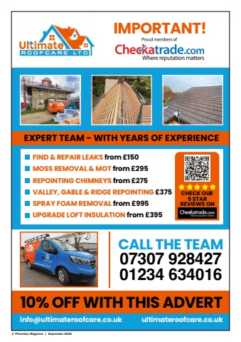 2 Phonebox Magazine | September 2025EXPERT TEAM - WITH YEARS OF EXPERIENCE10% OFF WITH THIS ADVERTCALL THE TEAMIMPORTANT!FIND & REPAIR LEAKS from %u00a3150MOSS REMOVAL & MOT from %u00a3295REPOINTING CHIMNEYS from %u00a3275VALLEY, GABLE & RIDGE REPOINTING %u00a3375SPRAY FOAM REMOVAL from %u00a3995UPGRADE LOFT INSULATION from %u00a3395 info@ultimateroofcare.co.uk ultimateroofcare.co.ukCHECK OUR 5 STAR REVIEWS ON07307 92842701234 63401607307 92842701522 42461602.qxp_Layout 1 19/05/2025 08:48 Page 101234 634016