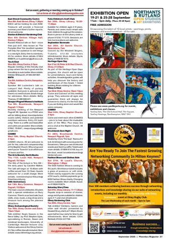 September 2025 | Phonebox Magazine 27Got an event, gathering or meeting coming up in October? Let us know at: diary@phoneboxmagazine.comEast Street Community CentreMon 8th, East Street, Olney, 7.30pmESCC will be holding its next AGM. Treasurer will provide a financial summary and there%u2019s further reports. All are welcome. Denton & District Gardening ClubMon 8th Denton Village Hall, Denton,7.30pmRussell Attwood talk on %u2018Soil %u2013 more than just dirt!%u2019. Also known as %u2018The Pumpkin Man%u2019 the excellent speaker will help the audience to see things in a new light. Entry free to members, %u00a35 for visitors. More details: 01604 890875, or m.pateman@yahoo.co.uk.Tea & ChatMon 8th, Olney Centre, 2-3pmRegular meeting of this friendly chat group where the tea is good and the friendship is even better. More details: Debbie Whitworth, 07494 681907.BNTATue 9th, Addison Centre, Kempston, 2.15pmSpeaker Bill Lockerbie%u2019s talk on Lamport Hall. Plenty of parking available. Everyone is welcome and there%u2019s no need to book. Small charge for admission. More details: Betty Thomas, 01480 860421.Newport Pagnell Women%u2019s InstituteTue 9th, Brooklands, Newport Pagnell, 7.15pmMonthly meeting of the Newport Pagnell WI. Speaker is a PCSO who will be talking about doorstep/online scams safety. Visitors and potential members welcome. Entry %u00a35 (cash only). There is a raffl e and tea/coff ee and cakes are provided. More details: 07851 704551, newportpagnellwi@gmail.com.CAMEOWed 10th, Olney Baptist Church, 2-4pmCAMEO returns. All are welcome to join for tea, cake and companionship at the Baptist Church. Why not go and see if you%u2019re %u2018Tuned In%u2019 to an afternoon of music and fun.The Arts Society North BucksThu 11th, Lovat Hall, Newport Pagnell, 10.15amThe title of the lecture is %u2018Eric Gill %u2013 the early years%u2019 by Caroline Walker. The talk will begin at 10.50am with coff ee served from 10.15am. Guests welcome for a small charge. More details: membershipnorthbucks@theartssociety.org.40th AnniversarySat 13th, Bury Common, Newport Pagnell, 12.30pmThe town council celebrates 40 years with a special celebration on Bury Common. There%u2019s a car boot sale, food stalls, a bar, music, a dog show and a treasure hunt among the planned attractions. Olney Archaeological SocietyTue 16th, Olney Centre and Zoom, 10am-12pmTalk entitled %u2018Anglo Saxons in the Nene Valley%u2019, by Prof. Stephen Upex, specialising in Roman, Saxon and medieval landscapes, University of Cambridge. Remote lecturer only. Visitors welcome at the Olney Centre: %u00a34. Tea, coff ee, biscuits included. More details: www.mkheritage.org.uk/oas.Folio Children%u2019s Craft ClubSat 20th, Olney Library, 10.30-11.30amSuitable for children ages 3-9 years. Parents and carers must remain with their children throughout the session. Book in person at the Library desk or phone 01234 711474. Sessions are free, but donations are welcome.September SerenadeSat 20th, All Saints Church, Ravenstone, 7pmConcert by the Windmill Singers, T i c ke t s : %u00a3 1 2 . 5 0 ( i n c l u d e s refreshments). More details: Glynis Bailey, 01908 551674.Heritage Open DaySun 21st, St Peter & St Paul Church, Olney, 2-4.30pmAs part of the Heritage Open Days program, the church will be open for presentations, tours and family activities. Knowledgeable guides will help you discover the history and architecture of this Grade 1 listed building. Brass rubbing for children.Olney is KindTue 23rd, Olney Centre, 10am-12pm%u2018Come and Connect%u2019 at this meeting group. They welcome all ages and guarantee there will always be someone to chat to. It%u2019s the fi rst step if you are feeling alone and would like some company.CAMEOWed 24th, Olney Baptist Church, 2-4pmCome and meet each other (CAMEO) %u2013 join in to hear about the invaluable work of the RNLI. Plus enjoy tea and a chat at the Baptist Church. All welcome.Brooklands Quiz NightFri 26th, Brooklands Centre, Newport Pagnell, 7pmHosted by: Chris %u2018The Quiz%u2019. Teams of 4 to 6, %u00a32.50 each with a money prize for the winners. Take your own drinks and snacks and there%u2019s a raffl e. Tickets and more details: 01908 614749, buy on the door, email: brooklandscentre@btinternet.com.Fashion Show and Clothes SaleSat 27th, St Laud%u2019s Church, Sherington, 1.30pmThe SOS Fashion Show is coming to St Laud%u2019s. %u00a36 entrance ticket includes a glass of prosecco or soft drink. Ticket money supports the running of St Laud%u2019s, clothes payments go to SOS Fashion Show charity. Changing rooms available. More details: Susan on 01908 610675.Saturday StoryTimeSat 27th, Olney Library, 11-11.30amPopular drop-in session of stories, songs and rhymes suitable for children ages 3-7 years but all welcome.Olney Gardening ClubTue 30th, Olney Centre, 7pmTalk entitled %u2018Climbers, twiners and other wall shrubs%u2019 presented by Howard Drury, starts at 7.30pm. Doors open half an hour early for time to get refreshments. More details: Chris Richbell, 01234 241700.Got an event coming up in October? Let us know at: diary@phoneboxmagazine.comEXHIBITION OPEN19-21 & 25-28 September11am %u2013 5pm daily, (Thurs 25 till 8pm)FREE ADMISSIONShowcasing the talent of 10 local artists %u2013 paintings, prints, ceramics and wood turned art %u2013 all for sale.Please see www.yardleyarts.org for events, exhibitions and classes.Yardley Arts, The Old School Hall, The Square,Yardley Hastings, Northampton, NN7 1EUYA Phonebox 92 x 135.indd 1 18/08/2025 13:11