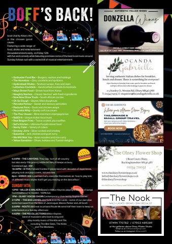September 2025 | Phonebox Magazine 33Serving authentic Italian dishes for breakfast, lunch and dinner. There is something for everyone!Open Tuesday to Saturday from 10am%u20132pm for breakfast and lunchand 6pm%u2013till late (last table bookings 8.30pm) for dinner2-3 Stanley Ct, Weston Rd, Olney MK46 5NHT: 01234 713179 E: enquiries@locandagabriella.co.ukAd 6 DONZELLA WinesAUTHENTIC ITALIAN WINESVISIT US: 2-3 STANLEY COURT, WESTON RD, OLNEYCALL US: 01234 713655 EMAIL: INFO@DONZELLAWINES.CO.UK DONZELLAWINES.CO.UKat the galleries above Olney Pilates StudioEmail us at 23thenook@gmail.comFollow us on Instagram @thenook2307494 770782 / 07903 489389we deliver to Olney and Milton Keyneslocal charity Ailsa%u2019s Aim is the chosen good cause.Featuring a wide range of food, drinks and entertainment the weekend starts early, on Friday 12th with fun and comedy while Saturday promises some of the best local music around. Sunday follows suit with a varied bill of musical entertainment.%u2022 Gutbuster Food Bar %u2013 Burgers, nachos and hotdogs%u2022 The Horsebox %u2013 Gins, cocktails and spritzers%u2022 Hyderabadi Dhaba %u2013 Tandoori wraps, fries and naan%u2022 Letterbox Cocktails %u2013 Handcrafted cocktails & mocktails%u2022 Maya Street Food %u2013 Street food from Korea%u2022 Naughty Nachos %u2013 Classic Nachos%u2019 with fresh ingredients%u2022 Now Now Chow Truck %u2013 South African curries%u2022 Oh So Dough %u2013 Glazed, fi lled doughnuts%u2022 Pancake Parlour %u2013 Sweet and savoury pancakes%u2022 Pastures Farm %u2013 Duck and chicken wraps%u2022 Pecorella Whip %u2013 Quality soft ice cream%u2022 The Pour House %u2013 Wine merchant champagne bar%u2022 RaSOI 6 %u2013 Unique Indian food truck%u2022 Real Belgian Fries %u2013 Twice cooked, plus waffl es%u2022 Saf%u2019s Kitchen %u2013 Ultimate Punjabi street food%u2022 Saxby Cider %u2013 Variety of ciders%u2022 Smokey Jim%u2019s %u2013 Slow-cooked and smokey%u2022 Susumba %u2013 Jerk chicken and goat curry%u2022 We Will Wok You %u2013 Asian noodles and rice curry%u2022 Yellow Sunshine %u2013 Olives, baklava and Turkish delights5:20PM %u2013 THE CANYONS: They say: %u2018sort of alt-country but also early-70s groovy, a little bit folky. It keeps us busy. Combined age, 308%u2019. 18:30PM %u2013 D-TOX: Female fronted 4-piece band with decades of experience, playing rock and pop covers, old and new. 8pm %u2013 ERROR 404: Local band who describe themselves as: %u2018love to play lots of diff erent music styles that%u2019ll get you moving on the dancefl oor%u2019. SUNDAY 14TH: 12PM %u2013 MILLER & WALKER:Based in Milton Keynes playing a mixture of songs from traditional to modern. 100% live.1PM %u2013 OLNEY VOICES CHOIR:Contemporary choir led by Sophie Garner.2:15PM %u2013 THE BAG LADIES:Jazz funk is on the cards %u2013 some of our own plus some borrowed from the likes of Jamiroquai, Maceo Parker and Jill Scott.3:30PM %u2013 ROUTE 33:Great local band Route 66 send half their team to keep us entertained on a Sunday afternoon.4:45PM %u2013 THE RECOLLECTIONS:Milton Keynes band of musicians who love to sing and play mostly music of the 60s and 70s including The Bee Gees, The Kinks%u2002%u2002 and The Monkees.BOFF%u2019S BACK!