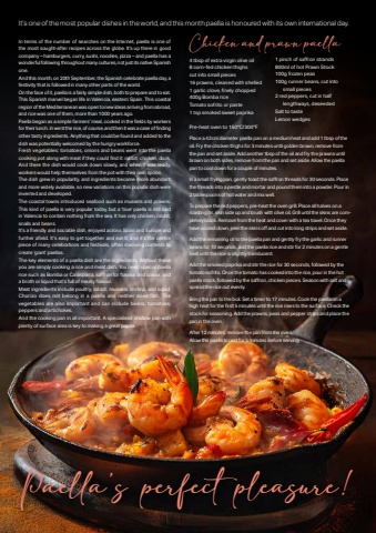 34 Phonebox Magazine | September 2025It%u2019s one of the most popular dishes in the world, and this month paella is honoured with its own international day.In terms of the number of searches on the Internet, paella is one of the most sought-after recipes across the globe. It's up there in good company %u2013 hamburgers, curry, sushi, noodles, pizza %u2013 and paella has a wonderful following throughout many cultures, not just its native Spanish one.And this month, on 20th September, the Spanish celebrate paella day, a festivity that is followed in many other parts of the world.On the face of it, paella is a fairly simple dish, both to prepare and to eat. This Spanish marvel began life in Valencia, eastern Spain. This coastal region of the Mediterranean was open to new ideas arriving from abroad, and rice was one of them, more than 1000 years ago.Paella began as a simple farmers' meal, cooked in the fi elds by workers for their lunch. In went the rice, of course, and then it was a case of fi nding other tasty ingredients. Anything that could be found and added to the dish was potentially welcomed by the hungry workforce. Fresh vegetables: tomatoes, onions and beans went into the paella cooking pot along with meat if they could fi nd it: rabbit, chicken, duck. And there the dish would cook down slowly, and when it was ready, workers would help themselves from the pot with their own spoon.The dish grew in popularity, and ingredients became more abundant and more widely available, so new variations on this popular dish were invented and developed.The coastal towns introduced seafood such as mussels and prawns. This kind of paella is very popular today, but a %u2018true%u2019 paella is still said in Valencia to contain nothing from the sea. It has only chicken, rabbit, snails and beans.It%u2019s a friendly and sociable dish, enjoyed across Spain and Europe and further afi eld. It%u2019s easy to get together and eat it, and it%u2019s the centre piece of many celebrations and festivals, often involving contests to create %u2018giant%u2019 paellas. The key elements of a paella dish are the ingredients. Without these you are simply cooking a rice and meat dish. You need special paella rice such as Bomba or Calasparra, saff ron for fl avour and colour, and a broth or liquid that%u2019s full of meaty fl avour.Meat ingredients include poultry, rabbit, mussels, shrimp, and squid. Chorizo does not belong in a paella and neither does fish. The vegetables are also important and can include beans, tomatoes, peppers and artichokes. And the cooking pan in all important. A specialised shallow pan with plenty of surface area is key to making a great paella.Chicken and prawn paell a4 tbsp of extra virgin olive oil8 corn-fed chicken thighscut into small pieces16 prawns, cleaned with shelled1 garlic clove, fi nely chopped400g Bomba riceTomato sofrito or paste1 tsp smoked sweet paprika Pre-heat oven to 150%u00b0C/300%u00b0FPlace a 42cm diameter paella pan on a medium heat and add 1 tbsp of the oil. Fry the chicken thighs for 3 minutes until golden brown, remove from the pan and set aside. Add another tbsp of the oil and fry the prawns until brown on both sides, remove from the pan and set aside. Allow the paella pan to cool down for a couple of minutes.In a small frying pan, gently toast the saff ron threads for 30 seconds. Place the threads into a pestle and mortar and pound them into a powder. Pour in 2 tablespoons of hot water and mix well.To prepare the red peppers, pre-heat the oven grill. Place all halves on a roasting tin, skin side up and brush with olive oil. Grill until the skins are completely black. Remove from the heat and cover with a tea towel. Once they have cooled down, peel the skins off and cut into long strips and set aside.Add the remaining oil to the paella pan and gently fry the garlic and runner beans for 10 seconds, add the paella rice and stir for 2 minutes on a gentle heat until the rice is slightly translucent. Add the smoked paprika and stir the rice for 30 seconds, followed by the tomato sofrito. Once the tomato has cooked into the rice, pour in the hot paella stock, followed by the saff ron, chicken pieces. Season with salt and spread the rice out evenly.Bring the pan to the boil. Set a timer to 17 minutes. Cook the paella on a high heat for the fi rst 5 minutes until the rice rises to the surface. Check the stock for seasoning. Add the prawns, peas and pepper strips and place the pan in the oven. After 12 minutes, remove the pan from the oven. Allow the paella to rest for 5 minutes before serving.1 pinch of saff ron strands800ml of hot Prawn Stock100g frozen peas100g runner beans, cut into small pieces2 red peppers, cut in half lengthways, deseededSalt to tasteLemon wedgesPaell a%u2019s perfect pleasure!