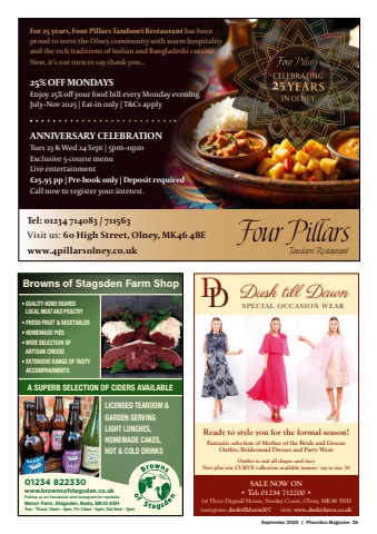 September 2025 | Phonebox Magazine 35Tel: 01234 714083 / 711563Visit us: 60 High Street, Olney, MK46 4BEwww.4pillarsolney.co.ukFour PillarsTandoofi RestaurantCELEBRATING YEARS IN OLNEYFour PillarsFor 25 years, Four Pillars Tandoori Restaurant has been proud to serve the Olney community with warm hospitality and the rich traditions of Indian and Bangladeshi cuisine. Now, it%u2019s our turn to say thank you...25% OFF MONDAYSEnjoy 25% off your food bill every Monday eveningJuly%u2013Nov 2025 | Eat-in only | T&Cs applyANNIVERSARY CELEBRATIONTues 23 & Wed 24 Sept | 5pm%u201311pmExclusive 5-course menuLive entertainment%u00a325.95 pp | Pre-book only | Deposit requiredCall now to register your interest.Ready to style you for the formal season!Fantastic selection of Mother of the Bride and Groom Outfits, Bridesmaid Dresses and Party WearOutfits to suit all shapes and sizesNew plus size CURVE collection available instore - up to size 30 Dusk till DawnSPECIAL OCCASION WEARDDSALE NOW ON %u2022 Tel: 01234 712200 %u20221st Floor Dagnall House, Stanley Court, Olney, MK46 5NH instagram: dusktilldawn007 visit: www.dusktdawn.co.ukLICENSED TEAROOM & GARDEN SERVING LIGHT LUNCHES, HOMEMADE CAKES, HOT & COLD DRINKSBrowns of Stagsden Farm Shop%u2022 QUALITY HOME REARED LOCAL MEAT AND POULTRY%u2022 FRESH FRUIT & VEGETABLES %u2022 HOMEMADE PIES%u2022 WIDE SELECTION OF ARTISAN CHEESE%u2022 EXTENSIVE RANGE OF TASTY ACCOMPANIMENTS A SUPERB SELECTION OF CIDERS AVAILABLEwww.brownsofstagsden.co.ukFollow us on Facebook and Instagram for updatesManor Farm, Stagsden, Beds, MK43 8SHTue - Thurs 10am - 4pm, Fri 10am - 5pm, Sat 9am - 3pm01234 822330