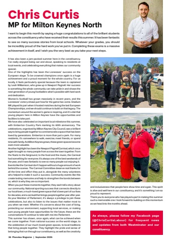 36 Phonebox Magazine | September 2025I want to begin this month by saying a huge congratulations to all of the brilliant students across the constituency who have received their results this summer. It has been fantastic to see so many success stories from local schools. Whatever your grades, you should be incredibly proud of the hard work you%u2019ve put in. Completing these exams is a massive achievement in itself, and I wish you the very best as you take your next steps. It has also been a jam-packed summer here in the constituency. I%u2019ve really enjoyed being out and about, speaking to residents at local events, and celebrating everything that makes our community special. One of the highlights has been the Lionesses%u2019 success on the European stage. To be crowned champions once again is a huge achievement and a proud moment for the whole country. For us locally, it feels particularly special because the team is captained by Leah Williamson, who grew up in Newport Pagnell. Her success is something the whole community can take pride in and shows the next generation of young footballers what%u2019s possible with hard work and dedication. Women%u2019s football has grown massively in recent years, and the Lionesses%u2019 victory shows just how far the game has come. Stadium MK played its part when it hosted matches during the last European Championships, and we should continue to build on that legacy. The momentum around the women%u2019s game is inspiring, and it%u2019s vital that young players here in Milton Keynes have the opportunities and facilities to take part. We have also celebrated an important local milestone this summer, with Emberton Country Park marking its 60th anniversary. The celebrations, organised by Milton Keynes City Council, was a brilliant way to bring people together to commemorate a space that has been loved by generations. Emberton is more than just a park. For many residents, it%u2019s somewhere to walk, exercise, meet friends, or spend time with family. As Milton Keynes grows, these green spaces become even more valuable. Another highlight has been the Newport Pagnell Carnival, which once again brought so many people from across the town together. From the fl oats to the fairground, to the food and the music, the Carnival had something for everyone. It%u2019s always one of the best weekends of the year, and it was fantastic to see so many people out enjoying it. Events like the Carnival don%u2019t happen without a huge amount of work behind the scenes. The Carnival Committee deserve real thanks for all the time and eff ort they put in, alongside the many volunteers who helped to make it such a success. Community events like this create lasting memories and help to strengthen the bonds between us, which is why they are so important. When you put these moments together, they each tell a story about our community. National sporting success that connects directly to our local town, a much-loved green space that%u2019s been part of our lives for decades, and a carnival that brings people together year after year. As your Member of Parliament, it%u2019s always a privilege to join these celebrations, but also to listen to the issues that matter most to you when we meet. Whether it%u2019s concerns about the cost of living, protecting our environment, supporting local services, or making sure young people have opportunities for the future, these are the conversations I%u2019ll continue to take with me into Parliament. This summer has shown, once again, what can be achieved when we come together. From national success on the world stage, to the celebration of our much-loved green spaces, to local traditions that bring people together. They highlight the pride and sense of belonging that run through our constituency, as well as the creativity Chris CurtisMP for Milton Keynes Northand inclusiveness that people here show time and again. This spirit is alive and well here in our constituency, and it%u2019s something I am so proud to represent. Thank you to everyone who has played a part in making this summer such a memorable one. I look forward to building on this momentum as we head into the months ahead.As always, please follow my Facebook page (@ChrisCurtisLabour) for frequent news and updates from both Westminster and our constituency.
