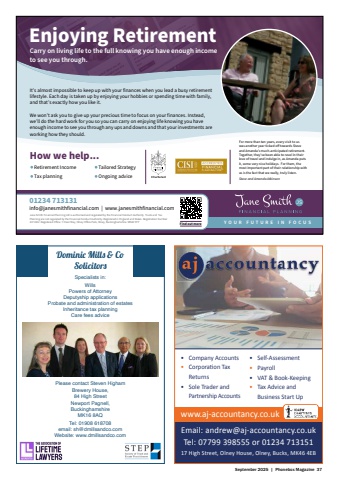 September 2025 | Phonebox Magazine 37%u2022 Company Accounts%u2022 Corporati on Tax Returns%u2022 Sole Trader and Partnership AccountsEmail: andrew@aj-accountancy.co.ukTel: 07799 398555 or 01234 71315117 High Street, Olney House, Olney, Bucks, MK46 4EB%u2022 Self-Assessment%u2022 Payroll%u2022 VAT & Book-Keeping%u2022 Tax Advice and Business Start Upwww.aj-accountancy.co.ukDominic Mills & CoSolicitorsSpecialists in:WillsPowers of AttorneyDeputyship applicationsProbate and administration of estatesInheritance tax planningCare fees advicePlease contact Steven HighamBrewery House, 84 High StreetNewport Pagnell, BuckinghamshireMK16 8AQTel: 01908 618708email: sh@dmillsandco.comWebsite: www.dmillsandco.comHow we help...Retirement IncomeTax planningTailored StrategyOngoing adviceY O U R F U T U R E I N F O C U S01234 713131info@janesmithfinancial.com | www.janesmithfinancial.comJane Smith Financial Planning Ltd is authorised and regulated by the Financial Conduct Authority. Trusts and Tax Planning are not regulated by the Financial Conduct Authority. Registered in England and Wales. Registration Number 4371002. Registered O%u0080ice: 7 Osier Way, Olney O%u0080ice Park, Olney, Buckinghamshire. MK46 5FPCarry on living life to the full knowing you have enough income to see you through.Enjoying RetirementIt%u2019s almost impossible to keep up with your finances when you lead a busy retirement lifestyle. Each day is taken up by enjoying your hobbies or spending time with family, and that%u2019s exactly how you like it.We won%u2019t ask you to give up your precious time to focus on your finances. Instead, we%u2019ll do the hard work for you so you can carry on enjoying life knowing you have enough income to see you through any ups and downs and that your investments are working how they should.Find out moreFor more than ten years, every visit to uswas another year ticked o%u00ad towards Steveand Amanda%u2019s much-anticipated retirement. Together, they%u2019ve been able to revel in their love of travel and indulge in, as Amanda puts it, some very nice holidays. For them, the most important part of their relationship with us is the fact that we really, truly listen.Steve and Amanda Atkinson
