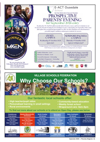 September 2025 | Phonebox Magazine 4101908 510342 01908 551253Castlethorpe First School Stoke Godlington CE SchoolvVILLAGE SCHOOLS FEDERATIONCastlethorpeFirst School01908 510342Newton Blossomville CE School01234 881294North CrawleyCE School01234 391282SheringtonCE School01908 610470 01908 605515Our fantastic local schools offer:%u2022 High teacher/pupil ratios%u2022 Personalised learning in small settings%u2022 Rural environments01234 881294 01234 391282 01908 218247To find out more about our schools or to attend an Open Day, please see belo Open DaysTues 14th October 1.30-2.30pmWeds 12th November 1.30-2.30pmOpen DaysThurs 16th October 1.30-3.00pmSat 15th November 10am-12.00pmOpen DaysTues 7th October 9am-10.30amTues 4th November 9am-10.30amOpen DaysTues 21st October 1.30pm-2.30pmThurs 20th November 1.30pm-2.30pm%u2022 Community-based education%u2022 Weekly forest school%u2022 Wraparound care: 8am%u20136pmWhy Choose Our Schools?Stoke GoldingtonCE School01908 551253Open DaysFri 10th October 9.30am-11amMon 10th November 1.30pm-3.00pmSt AndrewsCE School01908 605515Open DaysPlease see website for more information Quality of Education - GoodBehaviour & Attitudes - GoodPersonal Development - OutstandingLeadership & Management - OutstandingSixth Form Provision - GoodHeadteacher Mr. Paul McFadden warmly invites Parents, Carers, and Year 6 students to ourProspective Parents' Evening. If you're looking to secure a school place for September 2026, comeand explore the exceptional opportunities we offer. See first-hand how our school nurturespotential, inspires ambition, and prepares students for success.CAMPUSNEWPORT PAGNELLCAMPUSOLNEYWednesday 8 October 2025 th6pm startThursday 9 October 2025 th6pm or 6:30pm start*We are proud to be MKEducation Awards 2025 Winners!View our prospectus:www.ousedale.org.uk*Cedars Primary & Portfields Primary will start at 6pm. For Tickford Primary, GreenPark Primary & non-feeder schools the evening starts at 6.30pm.Ofsted, January 2025%u201cPupils attend a happy, respectfuland inclusive school. They proudlyembody the school's vision of \kind, work hard, succeedtogether.%u201dOFSTED (January 2025)HProsaCAMPUSWednesday 8 October 2025 thCAMPUSThursday 9 October 2025 thAWARDS 2019OUTCOMESEDUCATIONALSSAT