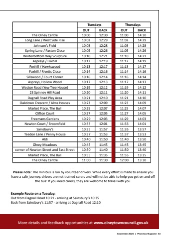 September 2025 | Phonebox Magazine 43Please note: The minibus is run by volunteer drivers. While every eff ort is made to ensure you have a safe journey, drivers are not trained carers and will not be able to help you get on and off the bus: If you need carers, they are welcome to travel with you.More details and feedback opportuniti es at www.olneytowncouncil.gov.uk Tuesdays ThursdaysOUT BACK OUT BACKThe Olney Centre 10:00 12:30 11:00 14:30Long Lane / West Side Rise 10:02 12:29 11:02 14:29Johnson%u2019s Field 10:03 12:28 11:03 14:28Spring Lane / Paxton Close 10:05 12:26 11:05 14:26Winterbott om Way Sculpture 10:10 12:21 11:10 14:21Aspreys / Foxhill 10:12 12:19 11:12 14:19Foxhill / Hawkswood 10:13 12:17 11:13 14:17Foxhill / Rivett s Close 10:14 12:16 11:14 14:16Sillswood / Court Corner 10:16 12:14 11:16 14:14Aspreys, Hollow Wood 10:17 12:13 11:17 14:13Weston Road (Yew Tree House) 10:19 12:12 11:19 14:1223 Spinney Hill Road 10:20 12:11 11:20 14:11Dagnall Road Play Area 10:21 12:10 11:21 14:10Oakdown Crescent / Alms Houses 10:23 12:09 11:23 14:09Market Place, The Bull 10:25 12:07 11:25 14:07Clift on Court 10:27 12:05 11:27 14:05Freemans Gardens 10:29 12:03 11:29 14:03Newton Court / Broomfi eld 10:33 12:01 11:33 14:01Sainsbury%u2019s 10:35 11:57 11:35 13:57Teedon Lane / Penny House 10:37 11:53 11:37 13:53Aldi 10:40 11:50 11:40 13:50Olney Meadows 10:45 11:45 11:45 13:45corner of Newton Street and East Street 10:50 11:40 11:50 13:40Market Place, The Bull 10:55 11:35 11:55 13:35The Olney Centre 11:00 11:30 12:00 13:30Example Route on a Tuesday:Out from Dagnall Road 10:21 - arriving at Sainsbury%u2019s 10:35Back from Sainsbury%u2019s 11:57 - arriving at Dagnall Road 12:10
