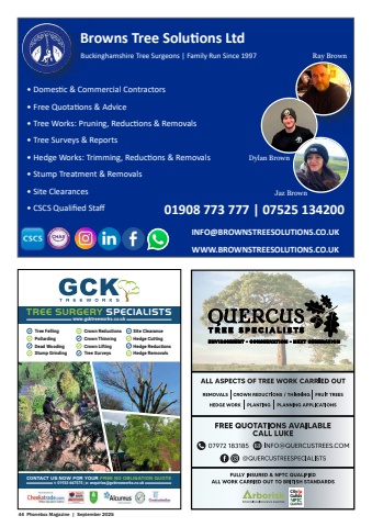 44 Phonebox Magazine | September 2025Browns Tree Solutions Ltd%u2022 Domestic & Commercial Contractors%u2022 Free Quotations & Advice %u2022 Tree Works: Pruning, Reductions & Removals %u2022 Tree Surveys & Reports %u2022 Hedge Works: Trimming, Reductions & Removals %u2022 Stump Treatment & Removals %u2022 Site Clearances%u2022 CSCS Qualified StaffBuckinghamshire Tree Surgeons | Family Run Since 1997INFO@BROWNSTREESOLUTIONS.CO.UKWWW.BROWNSTREESOLUTIONS.CO.UK01908 773 777 | 07525 134200Jaz BrownDylan BrownRay BrownTree Surgery SpecialistsWe provide professional tree care, landscaping and fencing services, in accordance with the rigorous standards laid out by the Arboricultural Association.For more information call: 01933 667575Email: enquiries@gcktreeworks.co.ukFREEquotes%u2022 Tree Felling%u2022 Pollarding%u2022 Dead Wooding%u2022 Stump Grinding%u2022 Crown Reductions%u2022 Crown Thinning%u2022 Crown Lifting%u2022 Tree Surveys%u2022 Site Clearence%u2022 Hedge Cutting%u2022 Hedge Reductions%u2022 Hedge RemovalsGCK Domestic leaflet A5.indd 1 14/08/2018 10:42TREE SURGERY SPECIALISTS www.gcktreeworks.co.ukTree FellingPollardingDead WoodingStump GrindingCrown ReductionsCrown ThinningCrown LiftingTree SurveysSite ClearanceHedge CuttingHedge ReductionsHedge RemovalsCONTACT US NOW FOR YOUR FREE NO OBLIGATION QUOTEt: 01933 667575 | e: enquiries@gcktreeworks.co.uk
