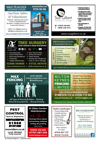 46 Phonebox Magazine | September 2025CALL US FOR A FREE QUOTATION 01908 616 112 or 01234 713 843 www.mk-fencing.co.uk %u2022 mk1fencing@aol.comMILTONKEYNESFENCINGLIMITEDOsbournes Farm, Newport Road, Emberton, MK46 5JDFor All Your Fencing, Decking and Sheds in Olney, Milton Keynes & Surrounding Areas A small family run business with over 25 years experienceAll Types of Fencing & Gates %u2022 DeckingPatios & Groundworks %u2022 Stump GrindingMAXFENCING07791 369709maxfencing@yahoo.com MaxFencing%u2022 Pruning, Hedgecutting, Leylandii reduction%u2022 Turfi ng & Planting%u2022 Patio Cleaning & Restoration%u2022 Fencing, Trellising & Fence repair%u2022 Bespoke log storesTaylor LandscapesPlease call Justin for a quote07816 097 79701234 714 634Leylandii reduction%u2022 Turfi ng & Planting%u2022 Fencing, Trellising TREE SURGERYSTUMP GRINDING & HEDGE MAINTENANCE01908 049955 %u2022 07731 467078www.monettreecare.co.uk %u2022 info@monettreecare.co.uk%u2022 Tree Removals%u2022 Crown Reductions%u2022 Removing Deadwood%u2022 Pollarding%u2022 Hedge Maintenance%u2022 Fruit Tree Pruning%u2022 Stump Removals%u2022 Cable Bracing%u2022 Dealing with dangeroustrees or storm damagePESTCONTROL %u201cAnts to Elephants%u201dRENTAKEEPER01 90 8510189www.killem.co.ukLocal, ReliableFully InsuredOffering all aspects of landscaping from maintenance to complete re-landscapingOffice: 01234 240430 Mobile: 07515 632666sjr@richardsonlandscapes.comFencing, Fence repairs and painting, Hedging, Turfing, Re-pointingFully InsuredB Gibbs Garden Maintenance01933 412 62107707 687 095bgibbs981@gmail.comCall 07508 519213 or email: jadonetti@outlook.comJAD Professional Garden & Horticulture ServicesNo obligation estimatesWE OFFER:Full Range of Lawn CarePruningPlantingGarden ClearanceHedging / CuttingTopiaryJet WashingWeed Control
