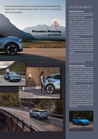 September 2025 | Phonebox Magazine 49QUICK BURSTS:Drivers%u2019 lost hoursDrivers spend an average of one day a year worrying about car-related matters, according to a new survey.The findings, from German car maker BMW, show that motorists %u2018lose%u2019 up to 565 hours of their lives, to car-related admin and maintenance planning of thing like service schedules, MOTs and repair work. More than 60% of drivers have missed important occasions because of their car, while others report that they have had to change their plans because of a motoring matter.Half of motorists (49%) said car admin takes up too much %u2018headspace%u2019: 52% said they will use a diary to organise car appointments with 37% relying on their car%u2019s dashboard alert to remind them. Nearly 40% have actively avoided visiting a garage for repair work when their car needed it.When asked what they would do if they had back the time spent on car worries, 33% said they%u2019d read a book, 32% would exercise more and 25% said they would have a well-earned holiday.Micra price revealedNissan has confi rmed pricing for its popular sixth-generation Micra, which was first shown in May this year. Pricing will start at %u00a322,995 for the all-electric 40kWh Engage model. The car is expected to qualify for a %u00a31,500 government Electric Car Grant, which would bring the price down further %u2013 although this grant has not yet been confi rmed. Recent tests have shown the Micra will go up to 260 miles on one charge. The Micra is the fi rst of four new fully electric cars to arrive in the brand%u2019s line-up. With a 100kW DC charger, powering up the little city car takes around 30 minutes to get to 80% charge. The company%u2019s services App allows the driver to maintain a remote control on proceedings, checking charge level, car location, charge scheduling, and temperature inside the vehicle all from their mobile phone.In America the Ford Explorer is a big V6 petrol-powered family utility vehicle with a 10-speed gearbox. But in the UK, it%u2019s a completely diff erent proposition.Phonebox Motoringwith Tom Johnston