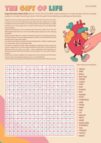 62 Phonebox Magazine | September 2025QUIZ CORNEROrganisers want as many local points of interest across the country to turn pink. In memory of more than 400 people who died last year waiting for an organ transplant, the annual scheme is to remind people of the importance of organ donation and to encourage them to confi rm their decision on the NHS Organ Donor Register.Lighting a building pink will commemorate those who died and to help the NHS highlight that there are more than 8,000 people waiting for a life changing transplant.Organ Donation Week is a national campaign focused on increasing awareness of organ donation and encouraging people to make an informed decision about donating their organs after death. It is observed annually during the last week of September. In 2025, it will take place from September 22nd to September 28th. The week is marked by social media campaigns designed to inform about the need for organ donors, how the organ donation process works, and the powerful diff erence that one donor can make. It also emphasizes the importance of discussing wishes with family members, as their support is crucial in the donation process.It takes two minutes to register as an organ donor, and could save up to nine lives in future. Visit: www.organdonation.nhs.uk or use the NHS App.In the meantime, have a go at our Wordsearch which is about parts of the human body.Organ Donation Week 2025 falls this month. Run by the NHS, it raises awareness of organ donation and encourages people to consider becoming a donor. And this year, they%u2019re lighting up buildings and landmarks.The gift of lifeE N H A I R T Q I I J B K R N Z GS X C D L S L P E A U L E G A I ZO T J H E B J N F N H K U Z N N EN O B H E G G V V O C T B H K Y BK O C M E E U W R A C O T T L C RM T F N R A K P B J H N L U E F EF H O B N F N X X A I G R O W W GL J F F O O A N K H N U R M H A NK Q O M A R Z A A Z J E E N H I IN B O A P E B N H B D Z D Q C S FE K T V D H D P C X W E L Y A T ZE Q I M M E J T I Q D L U I M E MC B Y K C A F K E L R B O Y O O OC F X D O D E O E R W O H E T P VM T M E A R B Y B E G W S T S P GO O R U K C E N O B W P O H Q P DP E A G O C B H E E L B U D X M OHere%u2019s what you%u2019re looking for:%u2022 ANKLE %u2022 ARM %u2022 BACK %u2022 BOTTOM %u2022 CHEEK %u2022 CHEST %u2022 CHIN %u2022 EAR %u2022 ELBOW %u2022 EYE %u2022 FINGER %u2022 FOOT %u2022 FOREHEAD %u2022 HAIR %u2022 HAND %u2022 KNEE %u2022 LEG %u2022 LIP %u2022 MOUTH %u2022 NECK %u2022 NOSE %u2022 SHOULDER %u2022 STOMACH %u2022 TOE %u2022 TONGUE %u2022 TOOTH %u2022 WAIST