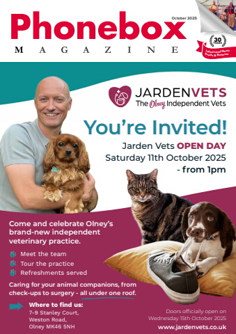 October 2025 | Phonebox Magazine 130YEARSLatest Local News Events & BusinessOctober 2025You%u2019re Invited!Jarden Vets OPEN DAYSaturday 11th October 2025- from 1pmCome and celebrate Olney%u2019sbrand-new independent veterinary practice.Meet the teamTour the practiceRefreshments servedCaring for your animal companions, from check-ups to surgery - all under one roof.Where to find us:7-9 Stanley Court, Weston Road,Olney MK46 5NH www.jardenvets.co.ukDoors officially open onWednesday 15th October 2025