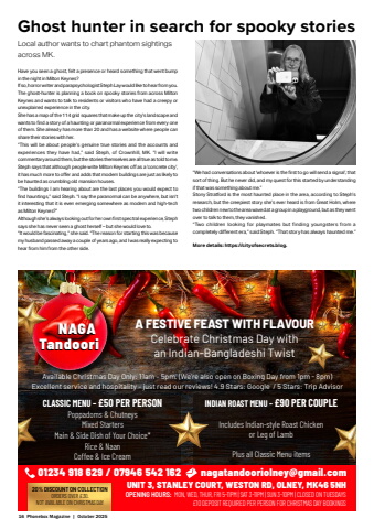 16 Phonebox Magazine | October 2025Ghost hunter in search for spooky storiesLocal author wants to chart phantom sightings across MK.Have you seen a ghost, felt a presence or heard something that went bump in the night in Milton Keynes?If so, horror writer and parapsychologist Steph Lay would like to hear from you. The ghost-hunter is planning a book on spooky stories from across Milton Keynes and wants to talk to residents or visitors who have had a creepy or unexplained experience in the city.She has a map of the 114 grid squares that make up the city%u2019s landscape and wants to fi nd a story of a haunting or paranormal experience from every one of them. She already has more than 20 and has a website where people can share their stories with her.%u201cThis will be about people%u2019s genuine true stories and the accounts and experiences they have had,%u201d said Steph, of Crownhill, MK. %u201cI will write commentary around them, but the stories themselves are all true as told to me.Steph says that although people write Milton Keynes off as a %u2018concrete city%u2019, it has much more to off er and adds that modern buildings are just as likely to be haunted as crumbling old mansion houses.%u201cThe buildings I am hearing about are the last places you would expect to fi nd hauntings,%u201d said Steph. %u201cI say the paranormal can be anywhere, but isn%u2019t it interesting that it is even emerging somewhere as modern and high-tech as Milton Keynes?%u201dAlthough she%u2019s always looking out for her own fi rst spectral experience, Steph says she has never seen a ghost herself %u2013 but she would love to.%u201cIt would be fascinating,%u201d she said. %u201cThe reason for starting this was because my husband passed away a couple of years ago, and I was really expecting to hear from him from the other side. %u201cWe had conversations about %u2018whoever is the fi rst to go will send a signal%u2019, that sort of thing. But he never did, and my quest for this started by understanding if that was something about me.%u201dStony Stratford is the most haunted place in the area, according to Steph%u2019s research, but the creepiest story she%u2019s ever heard is from Great Holm, where two children new to the area waved at a group in a playground, but as they went over to talk to them, they vanished.%u201cTwo children looking for playmates but finding youngsters from a completely diff erent era,%u201d said Steph. %u201cThat story has always haunted me.%u201dMore details: https://cityofsecrets.blog. 01234 918 629 / 07946 542 162 nagatandooriolney@gmail.comCLASSIC MENU %u2013 %u00a350 PER PERSONPoppadoms & ChutneysMixed StartersMain & Side Dish of Your Choice*Rice & NaanCoffee & Ice CreamINDIAN ROAST MENU %u2013 %u00a390 PER COUPLEIncludes Indian-style Roast Chicken or Leg of LambPlus all Classic Menu itemsTandooriNAGATandooriNAGA A FESTIVE FEAST WITH FLAVOURCelebrate Christmas Day with an Indian-Bangladeshi TwistAvailable Christmas Day Only: 11am %u2013 5pm. (We%u2019re also open on Boxing Day from 1pm - 8pm)Excellent service and hospitality %u2013 just read our reviews! 4.9 Stars: Google / 5 Stars: Trip AdvisorUNIT 3, STANLEY COURT, WESTON RD, OLNEY, MK46 5NH OPENING HOURS: MON, WED, THUR, FRI 5-11PM | SAT 3-11PM | SUN 3-10PM | CLOSED ON TUESDAYS%u00a310 DEPOSIT REQUIRED PER PERSON FOR CHRISTMAS DAY BOOKINGS 20% DISCOUNT ON COLLECTION ORDERS OVER %u00a330. NOT AVAILABLE ON CHRISTMAS DAY