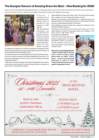 October 2025 | Phonebox Magazine 17Christmas 2025Reserve your perfect Christmas celebration with usSWAN REVIVED 1st - 24th December HOTEL33 High Street, Newport Pagnell, Bucks, Mk16 8ARinfo@swanrevived.co.uk | 01908 610565facebook.com/swanrevivedhotelinstagram.com/theswanrevivedFESTIVE MENU2 COURSES %u00a334.003 COURSES %u00a339.00%u00a315 per person non-refundable deposit upon booking. To reserve a table, please speak with reception. T&Cs apply.AT THEThe Georgian Dancers of Amazing Grace Are Back %u2013 Now Booking for 2026!If you%u2019ve ever witnessed the Georgian Dancers of Amazing Grace, you%u2019ll know their performances are far more than dance %u2013 they are a feast of colour, rhythm, and tradition that lifts the spirit and delights the senses.F o l l o w i n g a successful year of performances, this amateur group of volunteers is now opening its 2026 calendar.With strong interest anticipated, this is a great time for festivals, community events, and special occasions to book a memorable addition to their programme.Famed for their vibrant costumes, toe-tapping choreography, and authentic celebration of Georgian culture, the dancers bring audiences on a journey through centuries of heritage %u2013 all with an elegance that%u2019s impossible to resist.The group received some lovely feedback from this year%u2019s performances: Patricia, the activity coordinator at Broomfi eld Residential Care Home: %u201cThe show was outstanding from start to fi nish, and the residents thoroughly enjoyed themselves.%u201dJo Wareham of Olney Shenanigans said: %u201cWe were swept back in time thanks to the dancers who brought the world of Georgian fashion, etiquette and dance to life %u2013 and left us all in stitches.%u201dDebbie Whitworth, Olney town mayor, said. %u201cThe dancers were amazing with a capital A. So much energy and positivity. I loved it.%u201dWhether you%u2019re planning a local celebration or a large-scale event, the Georgian Dancers of Amazing Grace promise a performance that will leave your guests talking long after the fi nal bow. The exhibitions are free of charge with a request for donations for the Cowper and Newton Museum.The group is also looking for new dancers and invites you to a Free Taster Session on Friday, 7th November 2025, from 7-8.30pm, in The Olney Centre, High Street, Olney, Buckinghamshire, MK46 4EF.These fun and friendly sessions are all about enjoying dance in a relaxed atmosphere. There%u2019s no pressure to join the exhibition troupe, and you don%u2019t need a partner %u2013 just come along and give it a try!%u201dBook early to avoid disappointment %u2013 dates are fi lling fast! To fi nd out more or reserve a date for 2026, phone Helen on 07967 117019. Email contact.jones4647@gmail.com or online at www.cowperandnewtonmuseum.org.uk/support-us/georgian-dancers