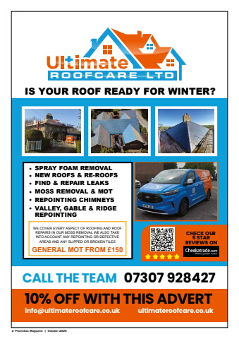 2 Phonebox Magazine | October 202510% OFF WITH THIS ADVERTCALL THE TEAMinfo@ultimateroofcare.co.uk ultimateroofcare.co.uk07307 928427ROOFCARE L TD%u00a3399.00%u00a3199.00R O O F S L T DWHERE PRESTIGE MEANS PROTECTIONACCREDITEDMEMBERSIS YOUR ROOF READY FOR WINTER?%u2022 SPRAY FOAM REMOVAL%u2022 FIND & REPAIR LEAKS%u2022 MOSS REMOVAL & MOT%u2022 REPOINTING CHIMNEYS%u2022 VALLEY, GABLE & RIDGE REPOINTINGWE COVER EVERY ASPECT OF ROOFING AND ROOF REPAIRS IN OUR MOSS REMOVAL WE ALSO TAKE INTO ACCOUNT ANY REPOINTING OR DEFECTIVE AREAS AND ANY SLIPPED OR BROKEN TILESGENERAL MOT FROM %u00a3150%u2022 NEW ROOFS & RE-ROOFSCHECK OUR 5 STAR REVIEWS ON