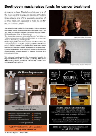 30 Phonebox Magazine | October 2025Beethoven music raises funds for cancer treatmentA chance to hear Charlie Lovell-Jones, one of the most exciting young violin soloists of modern times, playing one of the greatest concertos of all time, has been organised to raise money for the MK Cancer Centre.The concert has been arranged by Olney resident Catherine Rose, who says she was %u2018unlucky%u2019 to be diagnosed with breast cancer in 2022, but %u2018very lucky%u2019 to be treated in the place she calls %u2018the Palace on The Hill%u2019, MK Hospital%u2019s state-of-the-art Cancer Centre. %u201cOne of the drugs I was treated with is called Filgrastim,%u201d said Catherine. %u201cI discovered that it costs the NHS around %u00a35,000 just for that one drug. This is my chance to pay something back.%u201d Charlie will play Beethoven%u2019s Violin Concerto in D. Other works in the evening%u2019s programme are Haydn%u2019s Symphony no 92 %u2018The Oxford%u2019, since part of Catherine%u2019s treatment took place in Oxford, and Rossini%u2019s playful overture %u2018The Italian Girls in Algiers%u2019, because it%u2019s one of her favourites.Catherine is well-known as the conductor of three local choirs and other ensembles, including guesting for the Alina Orchestra, MK%u2019s professional orchestra.This orchestra, brought together for the occasion, is called the Filgrastim Philharmonia. The concert is on Saturday, 4th October at Stantonbury Theatre, and tickets will cost %u00a315, available fromwww.stantonburytheatre.co.uk. Image courtesy of Frank NoonImage courtesy of Simon RichardsonAW Home ImprovementsKITCHEN AND BATHROOM SPECIALISTMilton Keynes-based family business, established for over 20 yearsKitchen Supply & InstallationBathroom RefurbishmentsBathroom RepairFull House RefurbishmentsPlumbingTilingPlasteringFlooringAll work guaranteedCall 07773 793272 for a free quotationor visit www.awhi.co.ukBEFORE AFTERECLIPSE Spray Solutions Limited cover all aspects of spray painting. Including kitchen resprays, UPVC windows and doors, internal and external work such as mist coats and render sprays, along with furniture.FREE NO OBLIGATION QUOTESNOW TAKINGBOOKINGSFOR 2026Email us: eclipsespraysolutions@outlook.com or call: 07590 827738WHY CHOOSE SPRAYING? More time effi cient %u2022 Better quality fi nish %u2022 Provides a whole new look to a kitchen/bathroom for a fraction of the price of replacment