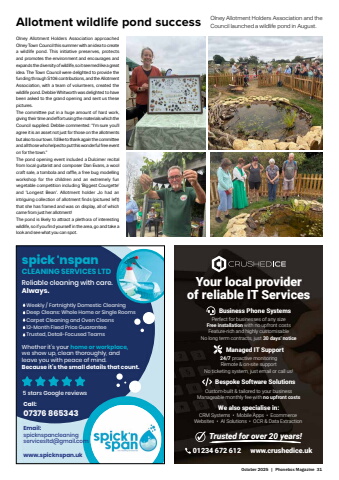 October 2025 | Phonebox Magazine 31Reliable cleaning with care.Always.spick nspanCLEANING SERVICES LTD Weekly / Fortnightly Domestic Cleaning Deep Cleans: Whole Home or Single Rooms Carpet Cleaning and Oven Cleans 12-Month Fixed Price Guarantee Trusted, Detail-Focused TeamsWhether it%u2019s your home or workplace, we show up, clean thoroughly, and leave you with peace of mind.Because it%u2019s the small details that count.Call:07376 865343Email:spicknspancleaningservicesltd@gmail.comwww.spicknspan.uk5 stars Google reviewsYour local providerof reliable IT ServicesWe also specialise in:CRM Systems %u2022 Mobile Apps %u2022 Ecommerce Websites %u2022 AI Solutions %u2022 OCR & Data Extraction 01234 672 612 www.crushedice.ukPerfect for businesses of any sizeFree installation with no upfront costsFeature-rich and highly customisableNo long term contracts, just 30 days' noticeManaged IT Support24/7 proactive monitoringRemote & on-site supportNo ticketing system, just email or call us!Business Phone SystemsBespoke Software SolutionsCustom-built & tailored to your businessManageable monthly fee with no upfront costsTrusted for over 20 years!Allotment wildlife pond success Olney Allotment Holders Association and the Council launched a wildlife pond in August. Olney Allotment Holders Association approached Olney Town Council this summer with an idea to create a wildlife pond. This initiative preserves, protects and promotes the environment and encourages and expands the diversity of wildlife, so it seemed like a great idea. The Town Council were delighted to provide the funding through S106 contributions, and the Allotment Association, with a team of volunteers, created the wildlife pond. Debbie Whitworth was delighted to have been asked to the grand opening and sent us these pictures.The committee put in a huge amount of hard work, giving their time and eff ort using the materials which the Council supplied. Debbie commented: %u201cI%u2019m sure you%u2019ll agree it is an asset not just for those on the allotments but also to our town. I%u2019d like to thank again the committee and all those who helped to put this wonderful free event on for the town.%u201dThe pond opening event included a Dulcimer recital from local guitarist and composer Dan Evans, a wool craft sale, a tombola and raffl e, a free bug modelling workshop for the children and an extremely fun vegetable competition including %u2018Biggest Courgette%u2019 and %u2018Longest Bean%u2019. Allotment holder Jo had an intriguing collection of allotment fi nds (pictured left) that she has framed and was on display, all of which came from just her allotment!The pond is likely to attract a plethora of interesting wildlife, so if you fi nd yourself in the area, go and take a look and see what you can spot.