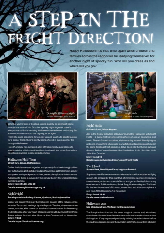 32 Phonebox Magazine | October 2025Whether you%u2019re trick or treating, joining a party, or staying at home to enjoy the annual 31st October spooky night together, there%u2019s always time to fi nd a haunting Halloween-themed event and scary fun activities in the run-up to the big day, for all ages. From little ones searching for creepy fun and laughs, to adults looking for a proper fright, there%u2019s plenty being off ered in our region for the run-up to Halloween.Here Phonebox has compiled a list of frighteningly good places to visit for adults, children and families. Check with the venue fi rst before travelling anywhere in case details change. Halloween Half TermWrest Park, Silsoe, BedfordshireGather the little monsters together and get ready for a bewitchingly brilliant day out between 25th October and 2nd November. With tales from spooky storytellers and spooky sword school, there%u2019s plenty for the little monsters. Admission to these is included in the standard entry fee. English Heritage members go free. Entry: from %u00a314.50, child %u00a39Details: www.english-heritage.org.ukNight FrightBuckinghamshire Railway Centre, Quainton, BuckinghamshireBigger and scarier this year, the Halloween season at the railway centre includes Tarot card readings by the Psychic Teacher, three new scare mazes, zombies, killer clowns on a train and haunted cellars. In the evening it%u2019s time to relax after your heart-stopping scares with live music from Petite Rouge, a disco, food and a bar. Runs on 31st October and 1st November. Entry: %u00a319.50Details: https://bucksrailcentre.orgFright FiestaGulliver%u2019s Land, Milton KeynesJoin in the freaky festivities at Gulliver%u2019s Land this Halloween with Fright Fiesta %u2013 a lively, festival-style atmosphere of colour, costumes, and music. There%u2019s fun and surprises, a fabulous day out with friendly frights and eerie encounters. Showcase your witches and zombies costumes in the spine-tingling street parade or delve deep into the theme park and discover Gulliver%u2019s spooktacular rides. Available on 11th-12th, 18th-19th, 25th-31st October.Entry: from %u00a319Details: www.gulliverslandresort.co.uk/fright-fi estaThe HowlScream Park, Mead Open Farm, Leighton BuzzardStep into a real-life horror movie and release the howl for another terrifying season. Be amazed by this night full of immersive scenery, live actors, street theatre, action and special eff ects, and get terrifi ed by full-on scary experiences in Full Moon Manor, Shriek Easy, Noxious Alley and The Shed. For the less brave there%u2019s DJ music, street food and a fun atmosphere. It runs from 10th October to 1st November. Entry: from %u00a329.95Details: www.thehowl.co.ukHalloween 2025Mini Meadows Farm, Welford, NorthamptonshireThe Pumpkin Lord has lost his seven magical charms and, with them, control over his army! Now they%u2019ve gone scarily mad, causing chaos across the kingdom. It%u2019s up to you and your family to bring back the balance before the madness spreads beyond the pumpkin patch! Check out the Forbidden Happy Halloween! It%u2019s that time again when children and families across the region will be readying themselves for another night of spooky fun. Who will you dress as and where will you go?A STEP IN THE FRIGHT DIRECTION!Dr Fright%u2019s Halloween NightsWhites Nurseries, Earls BartonFright FiestaGulliver's Land, Milton Keynes