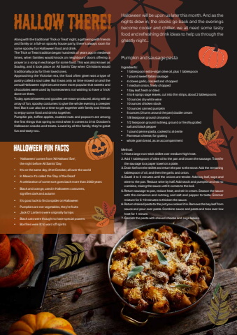 34 Phonebox Magazine | October 2025Halloween will be upon us later this month. And as the nights draw in, the clocks go back and the evenings become cooler and chillier, we all need some tasty food and refreshing drink ideas to help us through the ghastly night...Hallow there!Along with the traditional %u2018Trick or Treat%u2019 night, a gathering with friends and family or a full-on spooky house party, there%u2019s always room for some spooky fun Halloween food and drink.The Trick or Treat tradition began hundreds of years ago in medieval times, when families would knock on neighbours' doors off ering a prayer or a song in exchange for some food. This was also known as Souling, and it took place on All Saints' Day when Christians would traditionally pray for their loved ones.Approaching the Victorian era, the food often given was a type of pastry called a soul cake. But it was only as time moved on and the annual Halloween night became even more popular that sweets and chocolates were used by homeowners not wishing to have a 'trick' done on them.%u00a0Today, special sweets and goodies are mass-produced, along with an array of fun, spooky costumes to give the whole evening a creepier feel. But it can also be a time to get together with family and friends to enjoy some food and drinks together.Pumpkin pie, toff ee apples, roasted nuts and popcorn are among the fi rst things that spring to mind when it comes to 31st October's Halloween snacks and treats. Loved by all the family, they're great fun and tasty too.. %u2022 %u2018Halloween%u2019 comes from %u2018All Hallows' Eve%u2019, the night before All Saints' Day%u2022 It%u2019s on the same day, 31st October, all over the world%u2022 In Mexico it%u2019s called the %u2018Day of the Dead%u2019%u2022 A celebration of some sort goes back more than 2000 years%u2022 Black and orange, used in Halloween costumes, signifi es dark and autumn%u2022 It%u2019s good luck to fi nd a spider on Halloween%u2022 Pumpkins are not vegetables, they%u2019re fruits%u2022 Jack O%u2019 Lanterns were originally turnips%u2022 Black cats were thought to have special powers%u2022 Bonfi res were lit to ward off spiritsHalloween fun factsPumpkin and sausage pastaIngredients:%u2022 1 tablespoon extra-virgin olive oil, plus 1 tablespoon%u2022 1 pound sweet Italian sausage%u2022 4 cloves garlic, cracked and chopped%u2022 1 medium onion, fi nely chopped%u2022 1 bay leaf, fresh or dried%u2022 4 to 6 sprigs sage leaves, cut into thin strips, about 2 tablespoons%u2022 10 ounces dry white wine%u2022 10 ounces chicken stock%u2022 10 ounces canned pumpkin%u2022 5 ounces (3 turns around the pan) double cream%u2022 1/8 teaspoon ground cinnamon%u2022 1/2 teaspoon ground nutmeg, ground or freshly grated%u2022 salt and black pepper%u2022 1 pound penne pasta, cooked to al dente%u2022 Parmesan cheese, for grating%u2022 whole grain bread, as an accompanimentMethod:1. Heat a large non-stick skillet over medium-high heat. 2. Add 1 tablespoon of olive oil to the pan and brown the sausage. Transfer the sausage to a paper towel on a plate. 3. Drain fat from the skillet and return the pan to the stove. Add the remaining tablespoon of oil, and then the garlic and onion. 4. Saut%u00e9 3 to 5 minutes until the onions are tender. Add bay leaf, sage and wine to the pan. Reduce wine by half. Add stock and pumpkin and stir to combine, mixing the sauce until it comes to the boil. 5. Return sausage to pan, reduce heat, and stir in cream. Season the sauce with the cinnamon and nutmeg, and salt and pepper to taste. Simmer mixture for 5-10 minutes to thicken the sauce.6. Return drained pasta to the pot you cooked it in. Remove the bay leaf from sauce and pour over pasta. Combine sauce and pasta and toss over low heat for 1 minute. 7. Garnish the pasta with shaved cheese and sage leaves.