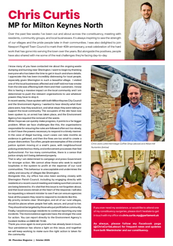 36 Phonebox Magazine | October 2025Over the past few weeks I%u2019ve been out and about across the constituency, meeting with residents, community groups, and local businesses. It%u2019s always inspiring to see the strength of our villages and the pride people take in their communities. I was also delighted to join Newport Pagnell Town Council to mark their 40th anniversary, a real celebration of the hard work that has gone into serving the town over the years. But alongside the positives, people have also shared with me some of the real challenges they%u2019re facing day-to-day.I know many of you have contacted me about the ongoing waste dumping and burning near Sherington. I want to begin by thanking everyone who has taken the time to get in touch and share details. I appreciate this has been incredibly distressing for local people, especially given Sherington is such a beautiful village. I visited one of the local businesses aff ected and staff told me how smoke from the site was aff ecting both them and their customers. I know this is having a massive impact on the local community and I am determined to push the relevant organisations to use whatever powers they have to stop it. In recent weeks, I have spoken with both Milton Keynes City Council and the Environment Agency. I wanted to hear directly what their plans were, how they would act, and what steps they were taking to support the local community. The occupiers of the site have now been spoken to, an arrest has taken place, and the Environment Agency has required the removal of the waste.While I hope we can quickly make progress, it points to a far bigger problem. When we face challenges like this, the organisations responsible for ensuring the rules are followed often act too slowly, or don%u2019t have the powers necessary to respond in a timely manner. In the case of illegal burning, court cases can take months as evidence is gathered, and then the fi nes are too small to create a proper disincentive. Too often, people see examples of the criminal justice system moving at a snail%u2019s pace, with neighbourhood policing stretched too thinly, and enforcement processes that feel dysfunctional. For too many communities, there is a sense that justice simply isn%u2019t being delivered properly. That is why I am determined to campaign and press Government for stronger action. We cannot allow those who seek to exploit loopholes in the system to profit at the expense of our rural communities. This behaviour is unacceptable and undermines the safety and security of villages like Sherington. Alongside this, my office has also been working closely with Sherington Parish Council, including by engaging directly with residents at a recent council meeting and making sure that concerns are being listened to. It%u2019s vital that this issue is not forgotten about, and that local voices remain at the heart of the response. I will also be requesting a relevant minister to see if we can ensure agencies have all the powers they need to respond to incidents like this. My priority remains clear: Sherington, and all of our rural villages, should be places where people feel safe, secure, and proud to live. They should not be targeted by those who put profi t before community. Finally, I would encourage residents to continue reporting any new incidents. The more evidence agencies have, the stronger the case for action. You can report directly to the Environment Agency%u2019s Incident Hotline on 0800 80 70 60. Thank you once again to everyone who has already been in touch. Your persistence has shone a light on this issue, and together we will keep working to make sure the right action is taken for the community. Chris CurtisMP for Milton Keynes NorthAs always, please follow my Facebook page (@ChrisCurtisLabour) for frequent news and updates from both Westminster and our constituency. If you ever need my assistance, or would like to attend one of my constituency surgeries, please don%u2019t hesitate to get in touch with my offi ce via chris.curtis.mp@parliament.ukChris visits Little Hermitage Coff ee Shop (above) and Alban Hill Nurseries (below)