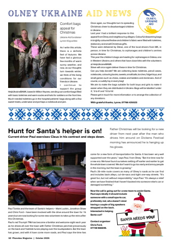 52 Phonebox Magazine | October 2025Hunt for Santa%u2019s helper is on! Current driver Paul exercises Claus in his contract and steps down. Father Christmas will be looking for a new driver from next year after the man who drives him around on Dickens Festival morning has announced he is hanging up his gloves. Paul Tombs and the team of Santa%u2019s helpers %u2013 Mark Luckin, Jonathon Shaw and Chris Ford %u2013 have been involved with the drive around the town for 15 years but are now looking for some new volunteers to take up the reins after this Christmas. Paul%u2019s red Triumph TR6 has become a familiar and welcome sight each year as he drives all over the town with Father Christmas perched precariously on the back and Yuletide tunes playing over the loudspeakers. But the town has grown, and with it have come more roads, and Paul says the time has come for a new form of transportation for Santa. It has been very well supported over the years,%u201d says Paul, from Olney. %u201cBut it is time now for a new era. We have found ourselves setting off earlier and earlier to get the whole town covered. We don%u2019t want to go too early and annoy people in the morning, but the town is growing.%u201d Paul%u2019s 25-mile route covers as many of Olney%u2019s roads as he can fi nd and includes back alleys, cul-de-sacs and tight one-way streets. %u201cIt%u2019s great fun, but not without responsibility,%u201d says Paul. %u201cIt%u2019s always a relief when we have fi nished that I haven%u2019t backed into someone else%u2019s car or damaged something.%u201d Now the call is going out for a new team to assist Santa. Paul says ideally it should include someone with a small sports car, preferably red, who doesn%u2019t mind having a couple of big speakers strapped on the back. Interested in helping Santa out? Contact organiser Chris Ford, 07748 966699.SANTA NEEDS YOU!OLNEY UKRAINE AID NEWSComfort bags appeal for ChristmasUkraine Aid fundraiser Lynne King writes:As I write this article, there is a definite feel of Autumn. We have had a glorious few months of warm sunny weather, and now, as our thoughts turn towards winter, we think of the living conditions for our friends in Ukraine.I c o n t i n u e t o support the group HelpUkraineBAMK, based in Milton Keynes, sending out comfort bags fi lled with basic toiletries and warm socks and hats for soldiers on the front line. Much-needed toiletries go in the hospital patients%u2019 bags along with a few sweet treats, underwear and perhaps a notebook and pen.%u00a0Once again, our thoughts turn to spreading Christmas cheer to disadvantaged children in Ukraine.%u00a0Last year I had a brilliant response to this appeal from Olney and neighbouring villages. Colourful drawstring bags in brightly coloured festive and children%u2019s fabric were fi lled with toiletries, stationery and small Christmas gifts.%u00a0These were delivered by Steve, one of the local drivers from MK, in person, in time for Christmas, to orphanages and children%u2019s centres across Ukraine.%u00a0This year the children%u2019s bags are heading for orphanages in Odesa, one in Western Ukraine, and others that have close links with the volunteers at HelpUkraineBAMK.%u00a0Steve will once again deliver these in time for Christmas.Can you help donate? We are collecting basic toiletries, pencil cases, notebooks, colouring books, sweets, small balls, torches, fi dget toys, and small games such as chess, snakes and ladders and dominoes. And of course, a cuddly toy in every bag!%u00a0We aim to make the bags suitable for both boys and girls to make it easier when they are distributed in Ukraine. Bags will be labelled %u2018under 3%u2019, %u20183 to 9%u2019 and %u201910 to16%u2019.%u00a0Please get in touch for more information or to arrange the collection of any donations. With grateful thanks, Lynne, 07766 425523