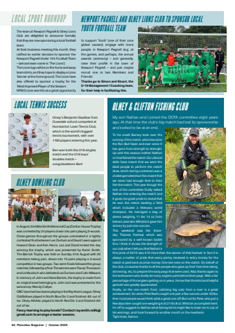 54 Phonebox Magazine | October 2025LOCAL SPORT ROUNDUPOLNEY BOWLING CLUBIn August, the Mike Smith Memorial Cup (Carlton House Trophy) was contested by 24 players drawn into pairs playing 3-woods. Close games throughout the groups culminated in a tightly contested fi nal between Les Durham and David Lewis against Howard Dean and Ken Harris. Les and David ended the day winning the trophy, which was presented by Karen Smith. The Barrick Trophy was held on Sunday 31st August with 20 members taking part, drawn into 10 pairs playing a 2-wood competition in two groups. Two semi-fi nals followed the group matches, followed by a fi nal. The winners were Tracey Thompson and Liz Murdoch who defeated Les Durham and Colin Millward. In memory of John and Nora Barrick, the trophy is made from an original bowl belonging to John and was presented to the winners by Wendy Collyer.OBC have had two teams playing in the Ray Keen League. Olney Oddfellows played in North Blue Div 2 and fi nished 4th out of six. Olney Athletic played in North Red Div 2 and fi nished 4th out of six. Fancy learning to play bowls? Contact ray.smith.rs95@gmail.com to arrange a taster session.NEWPORT PAGNELL AND OLNEY LIONS CLUB TO SPONSOR LOCAL YOUTH FOOTBALL TEAMOLNEY & CLIFTON FISHING CLUBTo his credit Barney took over the running of the match, which became the Ron Bull Open and ever since it has gone from strength to strength. Up until this season neither Nathan or I had fi shed the match. Our clerical skills have meant that we were the ideal people to perform the match draw, which during Lockdown was a challenge indeed but this meant that we never had enough time to then fi sh the match. This year though the rest of the committee fi nally talked Nathan into entering the match and it gives me great pride to reveal that he won the match beating a fi eld which included a Veterans world champion. He managed a bag of silvers weighing 11 lbs 14 oz from below Lavendon Mill which gave him victory by just nine ounces. This weekend saw the threeday Thames Festival, which was sponsored by a well known tackle fi rm. I think it shows the strength of our club when I tell you that Nathan%u2019s fi rst prize of %u00a3510 was %u00a310 more than the winner of that festival. In fact it is always a matter of pride that every penny received in entry money for the match is paid back as prize money. One last note on the match. On behalf of the club, a massive thanks to all the people who gave up their free time raking, strimming, etc, to prepare the sixty pegs that were used. Also thanks again to the landowners who kindly let many anglers park behind their pegs. With a fair percentage of the anglers getting on in years, I know that this kind and helpful gesture was greatly appreciated. Finally, on the non-match front, catching big carp from a river is a great achievement. So when Pete Nash caught one just a few ounces under 20 lbs, then most people would think what a great one off . But not for Pete, who just a few days later caught one weighing in at 21 lbs 8 oz. What an accomplishment.I%u2019m off to suggest to Nathan what fi shing kit he might like to treat me to out of his winnings, and I look forward to another month on the riverbank. Tight lines, Damon.My son Nathan and I joined the OCFA committee eight years ago. At that time the club%u2019s big match had lost its sponsorship and looked to be at an end. The team at Newport Pagnell & Olney Lions Club are delighted to announce formally that they are now sponsoring a local football team.At their business meeting this month, they ratifi ed an earlier decision to sponsor the Newport Pagnell Under 15%u2019s Football Team %u2013 (whose team name is %u2018The Lions%u2019).The Lions logo will be on the home and away team shirts, and they hope to display a Lions %u2018banner at the home ground. The Lions have also off ered to sponsor a trophy for the %u2018Most Improved Player of the Season%u2019.NP&O Lions see this as a great opportunity to support %u2018Youth%u2019 (one of their core global causes); engage with more people in Newport Pagnell (e.g. at the games, and perhaps, the annual awards ceremony) %u2013 and generally, raise their profi le in the town of Newport Pagnell %u2013 and just maybe recruit one or two Members and Friends!Thanks go to Simon and Stuart, the U-15 Management / Coaching team, for their help in facilitating this.LOCAL TENNIS SUCCESSOlney%u2019s Benjamin Swallow from Ousedale school competed at Hunstanton Lawn Tennis Club, which is the world%u2019s biggest tennis tournament, with over 1100 players entering this year. Ben won both the U16 singles match and the U16 boys%u2019 doubles match %u2013 congratulations Ben!