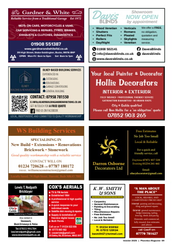 October 2025 | Phonebox Magazine 59WS Building ServicesSPECIALISING INNew Build %u2022 Extensions %u2022 RenovationsBrickwork %u2022 StoneworkGood quality workmanship with a reliable serviceCONTACT WILL ON01234 720628 OR 07787 180172email: williamcsconstruction@gmail.comLocally based, 74 High Street, Harrold, Beds MK43 7BHDarren OsborneDecorators LtdFree EstimatesNo Job Too SmallLocal & ReliableFor a quick and friendly service, callDaytime 07971 937 539Evening 01234 241 461Email: olneydecorator@gmail.comHollis DecoratorsEXPERIENCED IN: EXTENSIONSRENOVATIONS GARAGE CONVERSIONS GENERAL BUILDERCONTACT: 07958 781550 E: INFO@OLNEYBUILDINGANDRENOVATIONS.CO.UKGET IN TOUCH FOR A FREE QUOTE FIND US ON FACEBOOKLOCAL, INDEPENDENT, AND COMMITTED TO QUALITY WORKMANSHIPINGLOCAL, RELIABLE, AND COMPETITIVELY PRICED HELP Internal: painting and decorating,tiling and general repairsExternal: general maintenance, hedge trimming, turfing, fencing, sheds and pavingDomestic and commercial, fully insured, free estimates and advice.%u201cA MAN ABOUT THE PLACE%u201dcall Geoff on:07770 781627K .W . SMITH& SONS%u2022 Carpentry %u2022 General Maintenance%u2022 Painting & Decorating%u2022 Tiling%u2022 Miscellaneous Repairs%u2022 Free Estimates%u2022 No Job Too Small%u2022 Local & ReliableT: 01234 959162M: 07513 129124kwsmith57@hotmail.comCOX%u2019S AERIALS%u25cf TV & FM Aerials%u25cf Established 1964%u25cf A professional & high qualityservice%u25cf A quick response to yourindividual needs%u25cf Satellite dish moving & repairs%u25cf Supply & installation offreeview digital boxes%u25cf Multi PointsCall us on T: 01234 822 006M: 07974 933 526E: coxaerials@gmail.com28 Oakley Rd, Bromham, MK43 8HYCall us on T: 01234 822 006M: 07775 985 662E: coxaerials@gmail.com28 Oakley Rd, Bromham, MK43 8HYShowroom NOW OPENby appointment%u2022 Wood Venetian%u2022 Shutters%u2022 Perfect Fits%u2022 Rollers%u2022 Day/Night01908 502141info@davesblinds.co.ukwww.davesblinds.co.ukDavesBlindsdavesblinds%u2022 Verticals%u2022 Romans%u2022 Pleated%u2022 Skylights%u2022 VenetianWe offer a FREE, no obligation, quotation and measuring service.%u201901908 551387 www.gardnerandwhiteltd.co.uk39 High Street, Stoke Goldington, Bucks, MK16 8NPOPEN Mon-Fri 8am to 5pm Sat 8am to 1pmReliable Service from a Traditional Garage Est 1972MOTs ON CARS, MOTORCYCLES & VANS, CAR SERVICING & REPAIRS, TYRES, BRAKES, EXHAUSTS & CLUTCHES, DIAGNOSTICSAlso skilled in stonework, block driveways and patios. Specialising in small works.Tel 07833 991784 Email lewistredpath@gmail.comQualified Web www.lewistredpath.co.ukTel 07833 991784 lewistredpath@gmail.com www.lewistredpath.co.ukLewis T. Redpath BricklayerSpecialising in Small WorksAlso skilled inStonework, Block Driveways & Patios