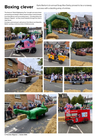 6 Phonebox Magazine | October 2025Boxing clever Earls Barton%u2019s bi-annual Soap Box Derby proved to be a runaway success with a dazzling array of entries.The theme of %u2018World Sightseeing Tour%u2019 brought out some clever and exciting cart designs. Riders wowed a large crowd of people from Earls Barton and surrounding towns %u2013 including Olney and Newport Pagnell %u2013 as they raced downhill through the town%u2019s High Street. Fourteen carts took part, with winner Chris Reece and %u2018Musk Do Better%u2019 posting a victorious time of 35.56 seconds.