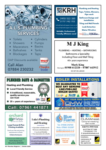60 Phonebox Magazine | October 2025info@bluefl amemk.co.ukwww.bluefl amemk.co.ukTel: 01908 216769Mob: 07860 332287PLUMBING AND HEATING ENGINEERSBREAKDOWNS AND INSTALLATIONSCONTACT US NOW FOR A QUOTE 33089A.L.S. PLUMBING SERVICESCall Alan07884 230232OAP Discounts available%u2022 Toilets%u2022 Showers%u2022 Macerators%u2022 Ballvalves%u2022 Blockages%u2022 Cylinders%u2022 Pumps%u2022 Basins%u2022 Tanks%u2022 TapsCentral Heating ServicesCLIMAheat192093KEITH PRYCEM: 07764 577 292T: 01234 241 172E: kpryce@climaheat.co.ukInstallation, maintenance &repairs on all Gas appliances%u25c6 Specialist in Bathroom & Wetroom refurbishments%u25c6 Local and Reliable%u25c6 Free Quotation for all jobsLuke%u2019s Plumbing and Heatinglukesplumbingmk@gmail.comwww.lukesplumbing.co.ukCall 07595 475565%u00ab Local Friendly Service%u00ab A traditional, reasonable, quality service you can trust%u00ab 25 + years of experienceCall: 07961 441871Vulcanhall ltd PLUMBER DAVE & DAUGHTERHeating and PlumbingM J KingPLUMBING ~ HEATING ~ BATHROOMSBathrooms a SpecialityIncluding Floor and Wall Tiling40+ years experienceMark KingSherington 01908 612320 ~ 07887 643912NO VAT ON LABOUR01933 322 28307717 742 702Plumbing and HeatingBathroom Design andInstallationTiling and Wall PanelsLeak DetectionWater FiltrationTaps, Toilets, Showers,Pipe workReliable, Professional,Friendly, Efficient, Localinfo@krhplumbingservices.co.ukwww.krhplumbingservices.co.ukFind out more: 01234 713 298 Unit 2, Stanley Court, Olney, Bucks, MK46 5NHLarge Format & Plan Printing AvailableEmail your fi les and printing requirements to Sarah:info@orchard.press
