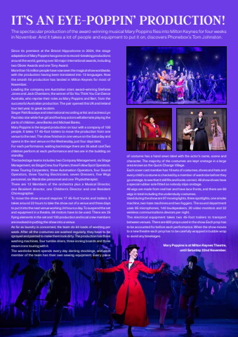 12 Phonebox Magazine | November 2025 The spectacular production of the award-winning musical Mary Poppins fl ies into Milton Keynes for four weeks in November. And it takes a lot of people and equipment to put it on, discovers Phonebox%u2019s Tom Johnston.IT%u2019S AN EYE-POPPIN%u2019 PRODUCTION!Since its premiere at the Bristol Hippodrome in 2004, the stage adaptation of Mary Poppins has gone on to record-breaking productions around the world, gaining over 50 major international awards, including two Olivier Awards and one Tony Award. More than 15 million people have now seen the magical show worldwide, with the production having been translated into 13 languages. Now the smash hit production has landed in Milton Keynes for most of November.Leading the company are Australian stars award-winning Stefanie Jones and Jack Chambers, the winner of So You Think You Can Dance Australia, who reprise their roles as Mary Poppins and Bert, from the successful Australian production. The pair opened this UK and Ireland tour last year, to great acclaim. Singer Patti Boulaye and international recording artist and actress Lyn Paul also star while fi ve girl and fi ve boy actors will alternate playing the parts of children Jane Banks and Michael Banks.Mary Poppins is the largest production on tour with a company of 100 people. It takes 17 45-foot trailers to move the production from one venue to the next. The show fi nishes in one venue on the Saturday and opens in the next venue on the Wednesday, just four days later. For each performance, waiting backstage there are 35 adult cast.Two children perform at each performance and two are in the building on standby.The backstage teams includes: two Company Management, six Stage Management, six Stage Crew, four Flymen, three Follow Spot Operators, three Touring Carpenters, three Automation Operators, four Sound Operators, three Touring Electricians, seven Dressers, five Wigs personnel, six Wardrobe personnel and one Physiotherapist.There are 12 Members of the orchestra plus a Musical Director, one Resident director, one Children%u2019s Director and one Resident Choreographer.To move the show around requires 17 45-foot trucks and trailers. It takes around 22 hours to take the show out of a venue and three days to put it into the next venue working 24 hours a day. To suspend the set and equipment in a theatre, 58 motors have to be used. There are 25 fl ying elements in the set and 100 production and local crew members are involved in putting the show into a venue.As far as laundry is concerned, the team do 64 loads of washing per week. After all the costumes are washed regularly, they have to be sprayed and painted to make them look dirty. The production has three washing machines, four tumble driers, three ironing boards and three steam irons touring with it.The wardrobe team spends every day darning stockings, and each member of the team has their own sewing equipment. Every piece of costume has a hand sewn label with the actor%u2019s name, scene and character. The majority of the costumes are kept onstage in a large area known as the Quick Change Village.Each cover cast member has 19 sets of costumes, shoes and hats and every child%u2019s costume is checked by a member of wardrobe before they go onstage, to see that it still fi ts and looks correct. All show shoes have a special rubber sole fi tted so nobody slips onstage.All wigs are made from real hair and have lace fronts, and there are 90 wigs in total including the understudy costumes.Used during the show are 97 moving lights, three spotlights, one smoke machine, two haze machines and two foggers. The sound department uses 95 microphones, 140 loudspeakers, 20 video monitors and 32 wireless communications devices per night.The electrical equipment takes two 45-foot trailers to transport between venues. There are 600 props used in the show. Each prop has to be accounted for before each performance. When the show moves to a new theatre each prop has to be carefully wrapped in bubble wrap to avoid any breakages.Mary Poppins is at Milton Keynes Theatre, until Saturday 22nd November.
